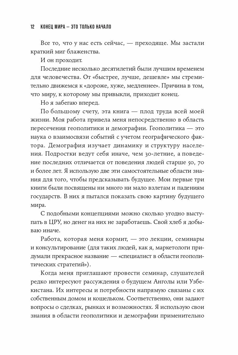 Мы живем в мире, который меняется очень быстро и иногда самым неожиданным образом. Какое будущее нас ждет? Обоснованы ли наши надежды на мир во всем мире и всеобщее благоденствие? Или человечеству грозит конец глобализации, распад глобальных экономических связей и угасание мировой торговли? На эти вопросы пытается ответить Питер Зейхан, специалист в области геополитики и геостратегии, основатель консалтинговой компании Zeihan on Geopolitics.Анализ важнейших глобальных тенденций развития мировой торговли, транспорта, финансовой системы, технологий, промышленного производства и сельского хозяйства, а также изменений в области экономической географии и демографических сдвигов позволяет автору представить читателю картину будущего мира, какой она ему видится, и показать, какие страны и регионы в обозримом будущем окажутся в выигрышном положении, а какие, возможно, ждет нищета и голод.Для широкого круга читателей, в том числе учащихся и специалистов в области экономики, демографии, экономической географии и других социальных наук.