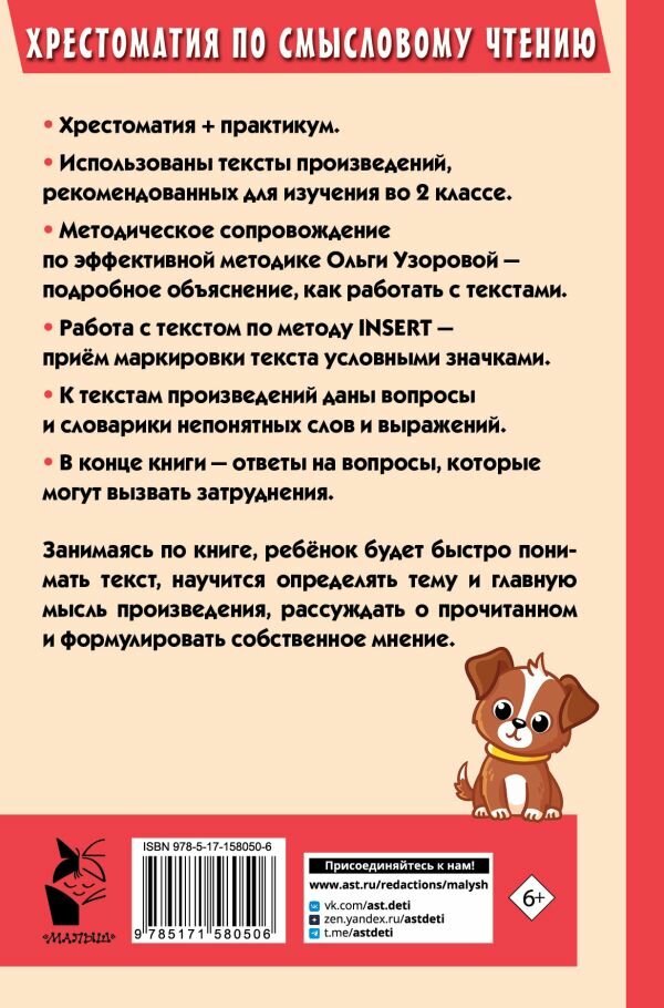 Перед вами отличный подарок ребенку-школьнику. Наша книга для детей сочетает в себе хрестоматию и практикум. Небольшие истории подобраны в соответствии со школьной программой 2 класса и сопровождаются подробными инструкциями по работе с текстом. Известный педагог Ольга Узорова разработала удобную и эффективную методику INSERT, которая научит ребенка структурировать, понимать и запоминать прочитанное, а также формулировать выводы и составлять собственное мнение о тексте.