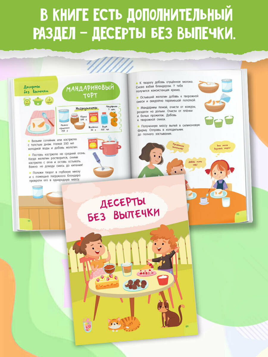 Большая книга, которой очень удобно пользоваться! Яркие иллюстрации, выполненные в стиле современных мультфильмов. Есть дополнительный раздел — десерты без выпечки.