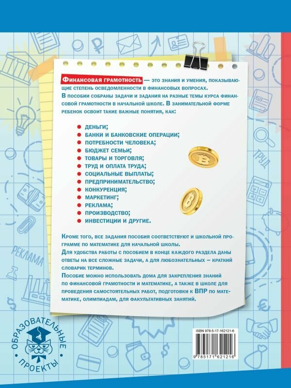 Пособие можно использовать дома для закрепления знаний по финансовой грамотности и математике, а также - в школе для проведения самостоятельных работ, подготовки к ВПР по математике, олимпиадам, факультативных занятий.