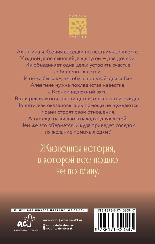 Алевтина и Ксения соседки по лестничной клетке. У одной двое сыновей, а у другой — две дочери. Их объединяет одна цель: устроить счастье собственных детей. И не «а бы как», а чтобы с пользой, для себя — Алевтине нужна покладистая невестка, а Ксении надежный зять. Вот и решили они свести детей, может что и выйдет. Но дети, как оказалось, в их помощи не нуждаются, и сами строят свои отношения. А тут еще наши дамы находят двух детей. Чем же это обернется, и куда приведет соседок их желание помочь людям? Жизненная история, в которой все пошло не по плану.