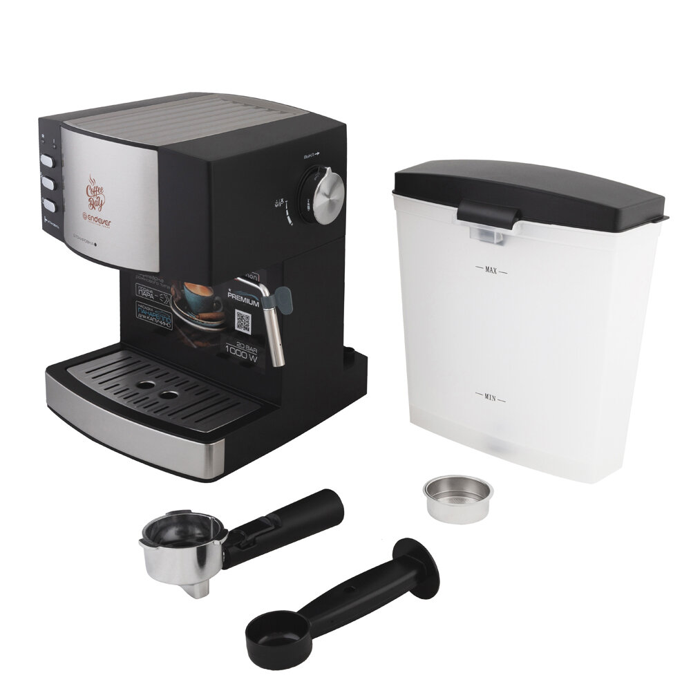Рожковая кофеварка ENDEVER лучший выбор для того, чтобы стать настоящим баристой!При производстве данной модели рожковой кофеварки ENDEVER наша команда дизайнеров смогла собрать в этой кофеварке только самые передовые технологии на данный момент. Мощная итальянская помпа способна выдавать значительные 20 бар, высокая мощность в 1000 Вт, электронная начинка делает эту модель кофеварки одной из лучших среди своих конкурентов на рынке. Она позволит Вам проводить эксперименты и готовить такие напитки, как эспрессо, лунго, американо.Съемная насадка ПАНАРЕЛЛО расширит возможности и позволит подогреть молоко и приготовить густую молочную пену для капучино и латте. Насадку можно мыть в посудомоечной машине. Молоко для более густой пены требуется охлажденное и не ниже 2.5% жирности.Съемный лоток для капель, которым оснащена данная рожковая кофеварка ENDEVER , позволяет не мыть кофеварку полностью, а удалить остатки воды просто сняв данный лоток. Сверху кофеварки есть специальная платформа для подогрева чашек, при помощи которой предварительно можно прогреть чашку, чтобы Ваш напиток не остыл и сохранил нужную температуру как можно дольше.Строгий минималистичный дизайн в черно-стальном цвете подходит для большинства интерьеров. Небольшие размеры кофеварки не потребуют много места на Вашей кухне. Съемный бак для воды 1, 6 литра позволит приготовить кофе для всех своих гостей. Фильтр из нержавеющей стали для рожка сохранит аромат молотого кофе. Помимо приготовления кофе кофеварка способна просто подать кипяток, например для заваривания чая. При помощи мерной ложки с темпером Вы всегда сможете ровно отмерить и утрамбовать кофе в фильтре.Испытайте на вкус настоящий кофе с рожковой кофеваркой ENDEVER !