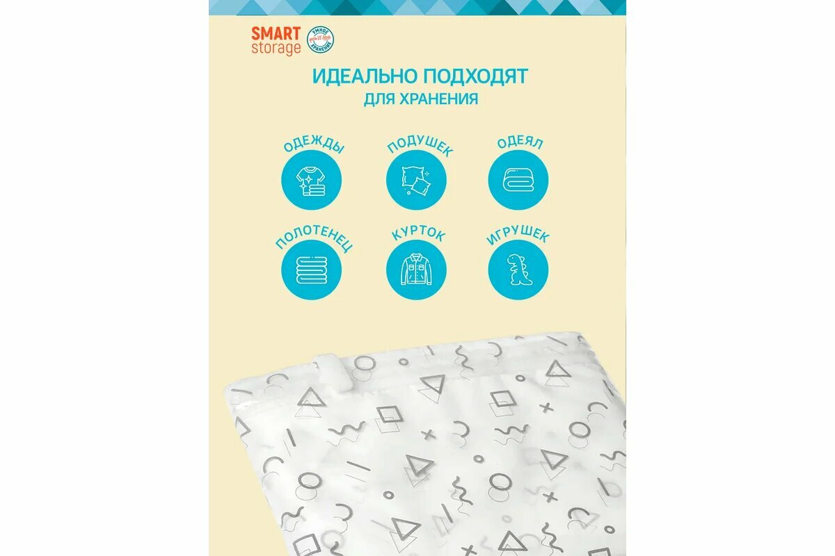 Вакуумный пакет You`ll love из линейки Smart Storage - инновационное решение хранения вещей. Отличительной особенностью пакета является наличие стильного принта в виде геометричных фигур деликатного серого цвета на белом фоне. Принт добавит стильное настроение в гардеробную. Размер пакета 60*80см предназначен для хранения сезонных вещей в межсезонье, отлично подойдет для хранения одеял и подушек. Пакет имеет удобную застежку zip-lock прозрачного цвета со специальным зажимом. Зажим превосходно скользит по застежке zip-lock, обеспечивая плотное закрытие и препятствуя попаданию воздуха внутрь пакета. Прозрачная сторона пакета позволяет быстро определить, что хранится внутри пакета. Пакет оснащен клапаном, который позволяет завакуумировать вещи за считанные секунды с помощью пылесоса. Использование пакета обеспечивает экономию до 75% объёма. Защищает вещи от влаги, пыли, запаха и насекомых.