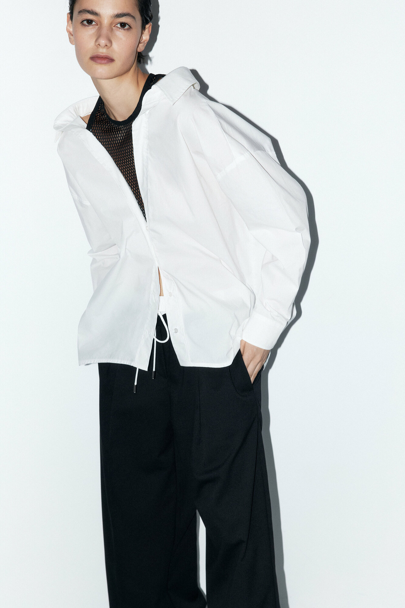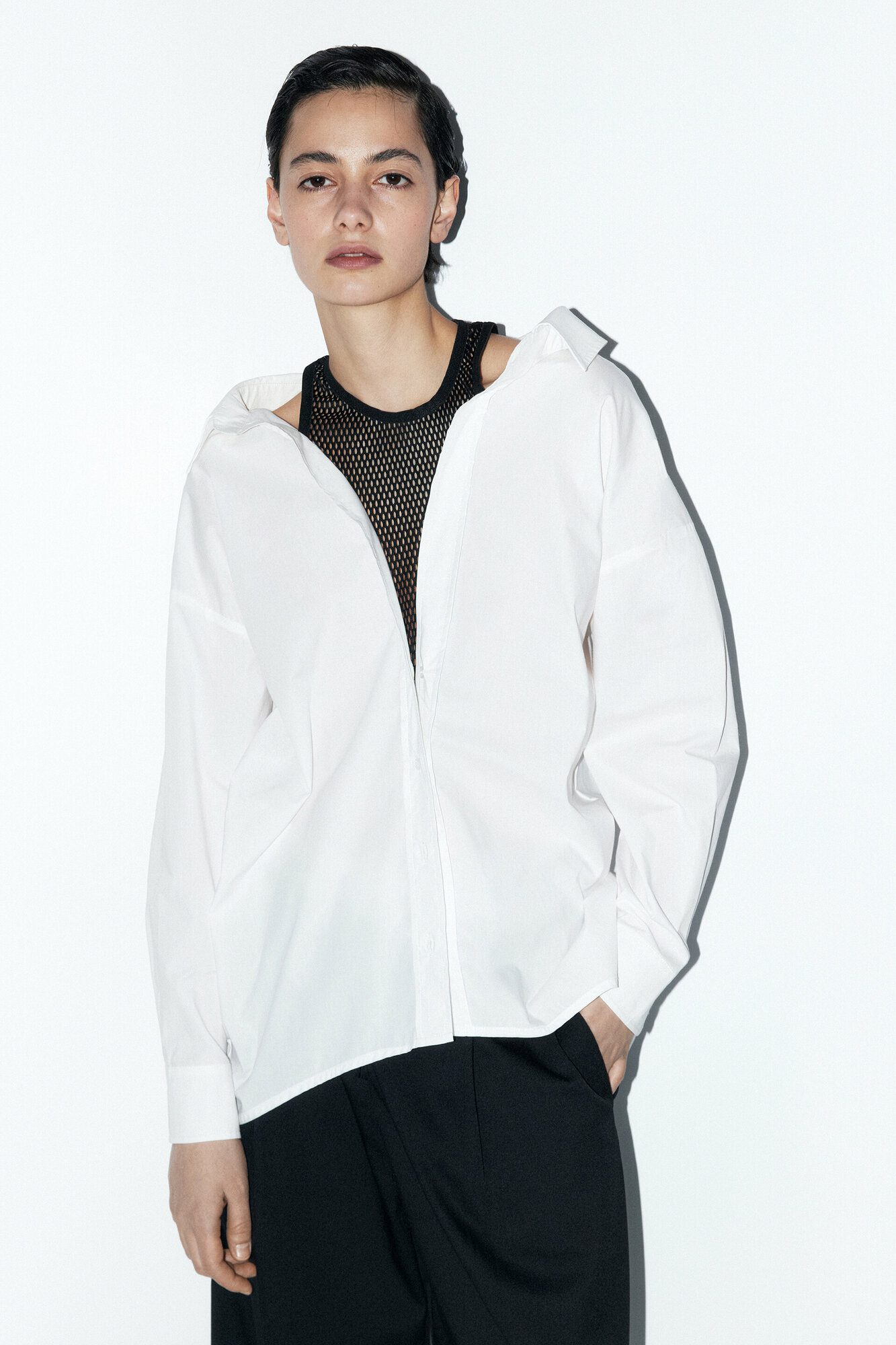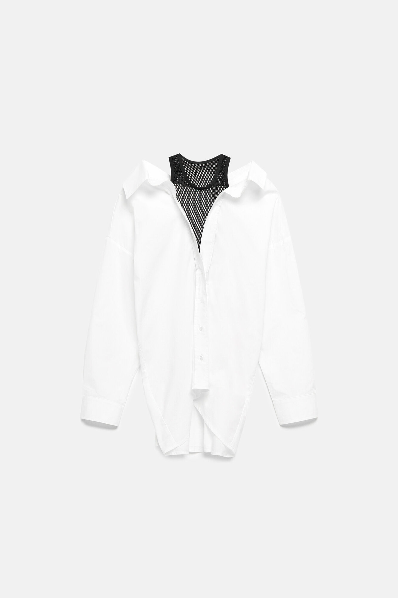 - Рубашка oversize с майкой из сетки. Удлиненная женская рубашка суперсвободного кроя оверсайз из легкой, гладкой хлопковой ткани