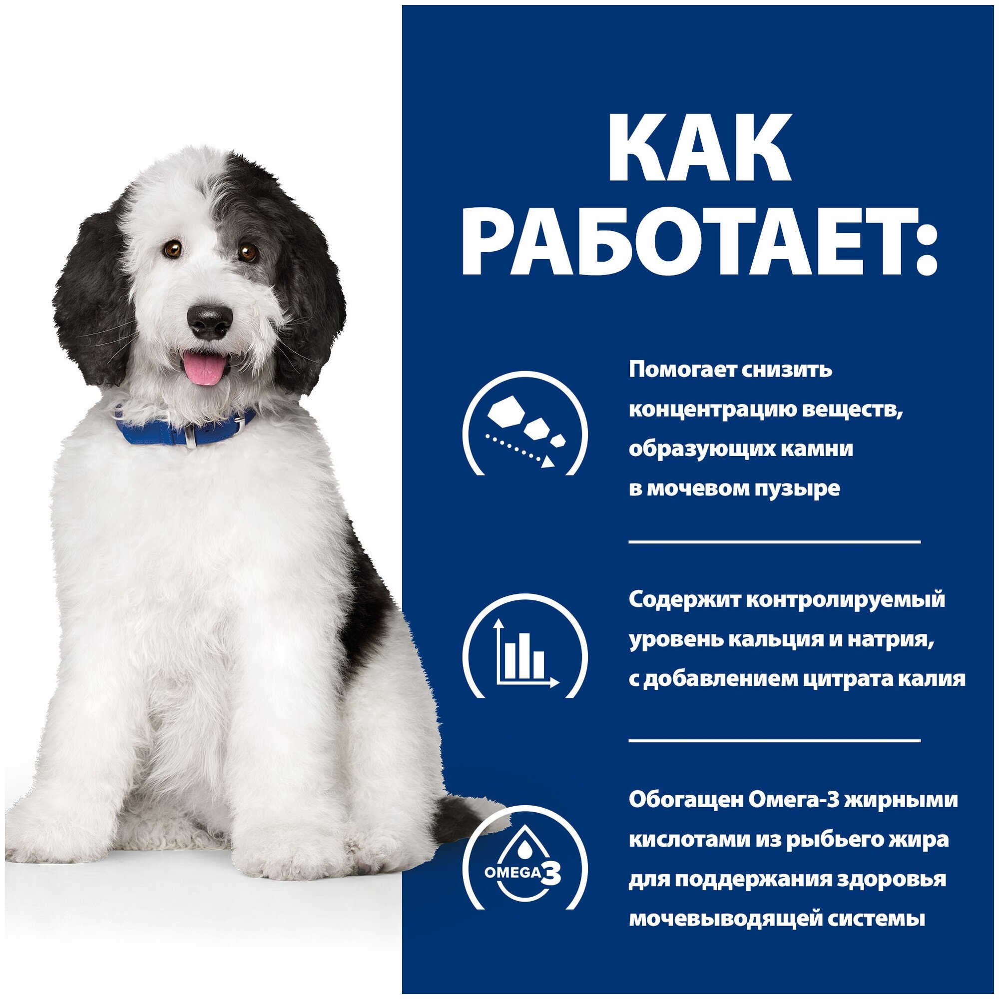Поддержания здоровья мочевыводящих путей у собак и снижения риска образования струвитных и кальция оксалатных уролитов. Помогает снизить концентрацию компонентов уролитов.