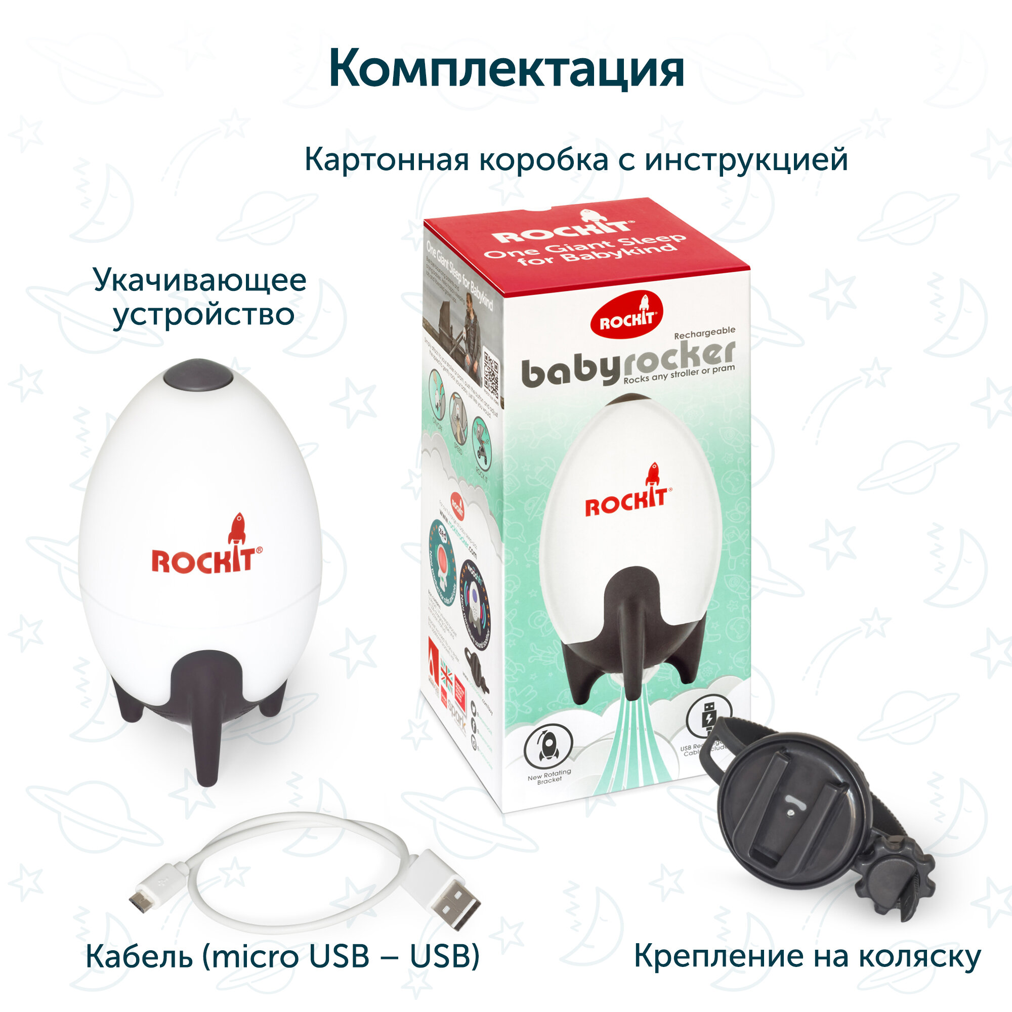 | Комплект поставки | убаюкивающее устройство, USB кабель, ремешок для крепления к коляске |