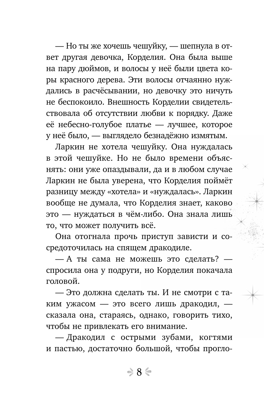 Ларкин – дочь Ведьмы Топей, и ей уже исполнилось одиннадцать лет, но она до сих пор не может зажечь магией свечу, изменить цвет волос или хотя бы заставить перо левитировать. Вот её подруга Корделия уже открыла свой дар, и чем Ларкин хуже? Но скоро та сама ночь Зимнего Солнцестояния и полнолуния. Та ночь, когда Ларкин обретёт свою магию. В кармане у неё чешуйка дракодила – талисман на удачу. Только, похоже кое-кто не хочет, чтобы девочка обрела силу...