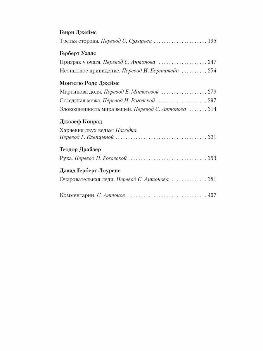 | Автор(ы) | Дэвид Герберт Лоуренс, Джозеф Конрад, Джозеф Шеридан Ле Фаню, Элизабет Гаскелл, Монтегю Родс Джеймс, Натаниель Готорн, Роза Малхолланд, Чарльз Диккенс, Герберт Джордж Уэллс, Джером Клапка Джером, Генри Джеймс, Ричард Марш, Чарльз Оллстон Коллинз, Чарльз Лоренс Янг |