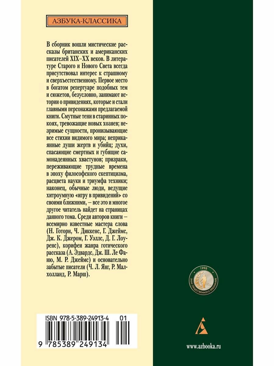 В сборник вошли мистические рассказы британских и американских писателей XIX–XX веков. В литературе Старого и Нового Света всегда присутствовал интерес к страшному и сверхъестественному. Первое место в богатом репертуаре подобных тем и сюжетов, безусловно, занимают истории о привидениях, которые и стали главными персонажами предлагаемой книги. Смутные тени в старинных покоях, тревожащие новых хозяев; незримые сущности, пронизывающие все стихии видимого мира; неприкаянные души жертв и убийц; духи, спасающие смертных и губящие самонадеянных хвастунов; призраки, переживающие трудные времена в эпоху философского скептицизма, расцвета науки и триумфа техники; наконец, обычные люди, ведущие хитроумную «игру в привидений» со своими ближними, – все это и многое другое читатель найдет на страницах данного тома. Среди авторов книги – всемирно известные мастера слова (Н. Готорн, Ч. Диккенс, Г. Джеймс, Дж. К. Джером, Г. Уэллс, Д. Г. Лоуренс), корифеи жанра готического рассказа (А. Эдвардс, Дж. Ш. Ле Фаню, М. Р. Джеймс) и основательно забытые писатели (Ч. Л. Янг, Р. Малхолланд, Р. Марш).