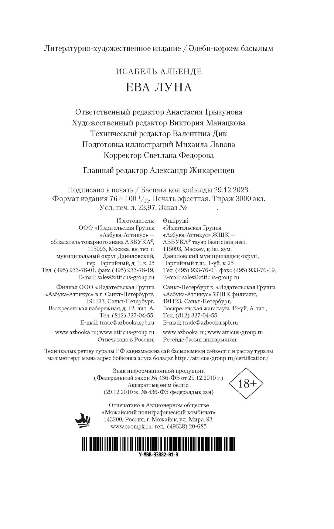 Исабель Альенде — суперзвезда латиноамериканской литературы наряду с Габриэлем Гарсиа Маркесом, одна из самых знаменитых женщин Южной Америки, обладательница многочисленных премий, автор книг, переведенных на десятки языков и выходящих суммарными тиражами, которые неуклонно приближаются к ста миллионам экземпляров. «Ева Луна» (1987) — ее ранний роман о том, что в конечном счете ничего важнее историй в этом мире нет. Генералы, ученые, партизаны, бандиты, хозяйка борделя, безумцы, негодяи, святые... «Ева Луна» — сказание о сказительнице, роман о сиротке, служанке, фабричной работнице, сценаристке, обладательнице бурной биографии и буйной фантазии. Здесь говорит Ева Луна — Оливер Твист, Шахерезада и барон Мюнхаузен, трикстер, подводный камень, проницательная свидетельница, которая протянет руку помощи или просто, одарив любопытным взглядом, запомнит, сохранит память и потом расскажет о том, что видела.