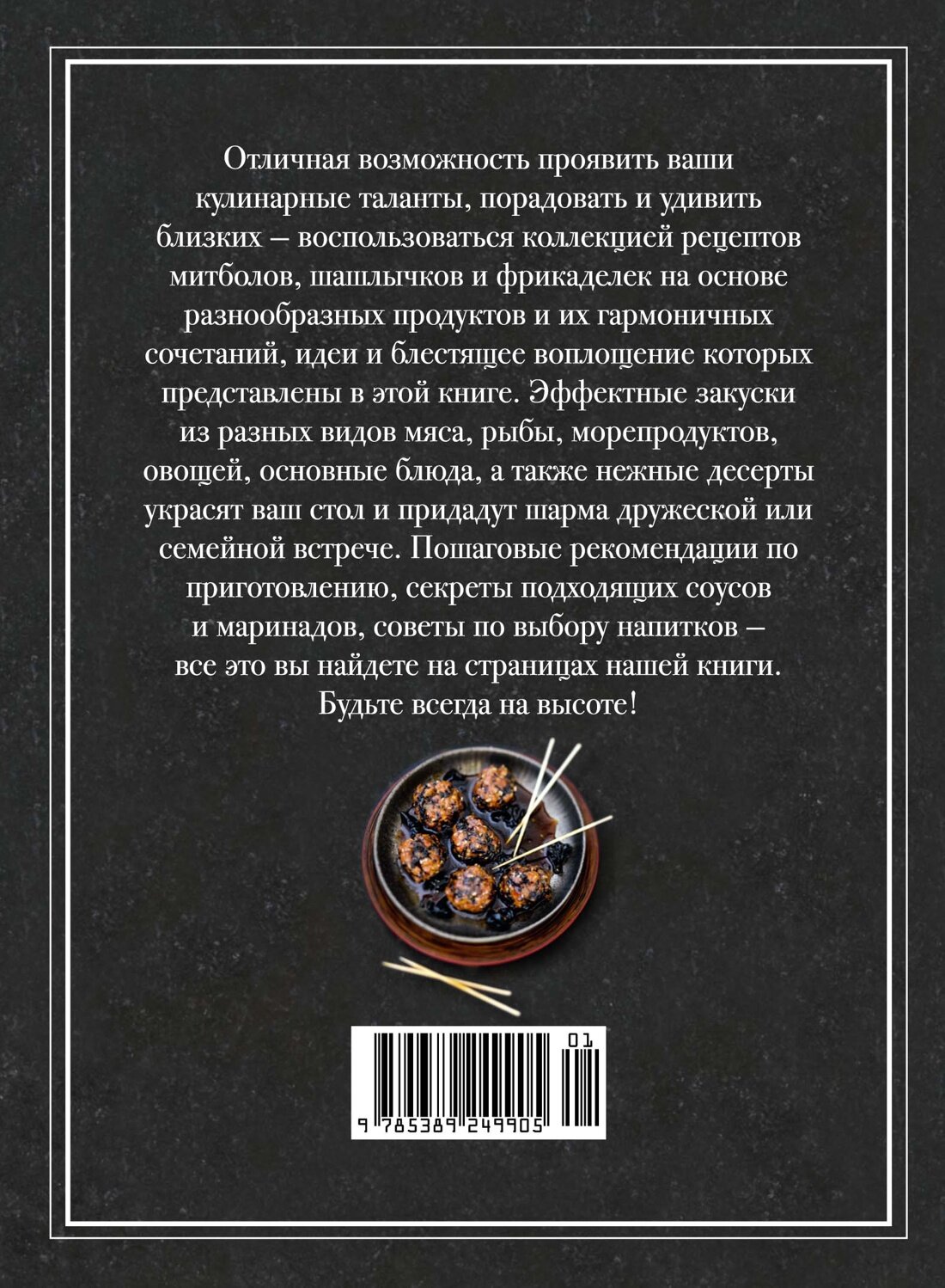 Домашняя кухня становится по-настоящему уютной и притягательной, когда на ней с ду- шой и фантазией готовят разнообразные блюда, чтобы порадовать близких. А если в числе этих блюд будут шашлычки, митболы и фрикадельки, приготовленные по рецеп- там из этой книги, то вам гарантирован не только вкусный обед или ужин, но и поисти- не эстетическое наслаждение — особенно в праздник! Любители мяса могут выбрать, что их заинтересует в первую очередь: митболы из свинины с арахисом и красным лу- ком или из баранины по-мароккански, шашлычки из утки в апельсиновой глазури или из говядины, маринованной с тайским базиликом и соей… Те, кто предпочитает рыбу и мо- репродукты, обратят внимание на фрикадельки из лосося, трески или креветок со все- возможными пряными добавками; ценители пользы и яркого вкуса овощей и фруктов также найдут для себя несколько отличных рецептов закусок и десертов на их основе — в эффектном виде шашлычков или в нежном исполнении шариков или фрикаделек. Пусть у вас на кухне витают запахи ваших любимых приправ и ароматы домаш- них блюд — с помощью этой книги вы добьетесь отличных результатов и получите в награду благодарные улыбки гостей.