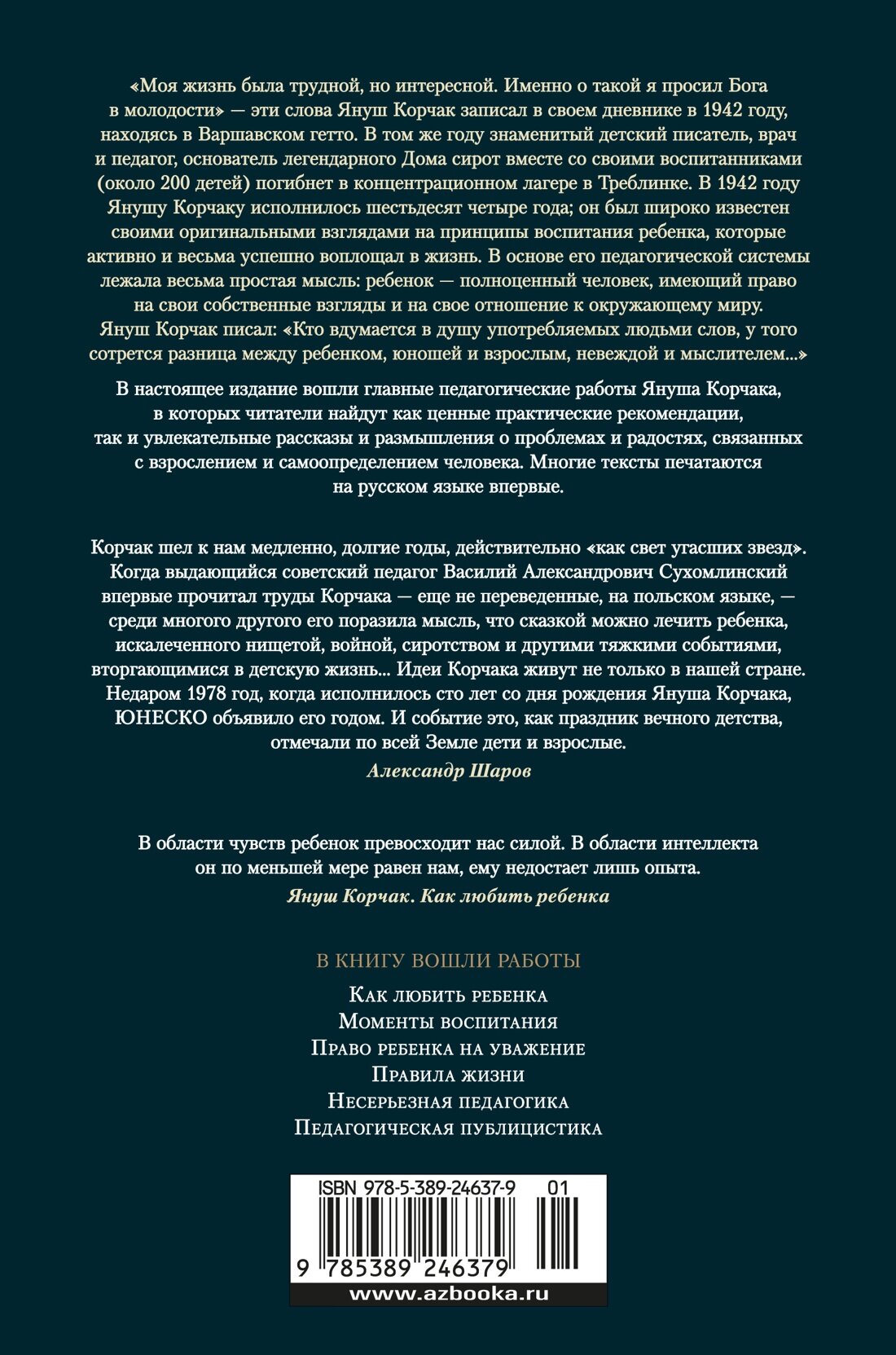 «Моя жизнь была трудной, но интересной. Именно о такой я просил Бога в молодости» — эти слова Януш Корчак записал в своем дневнике в 1942 году, находясь в Варшавском гетто. В том же году знаменитый детский писатель, врач и педагог, основатель легендарного Дома сирот вместе со своими воспитанниками (около 200 детей) погибнет в концентрационном лагере в Треблинке. В 1942 году Янушу Корчаку исполнилось шестьдесят четыре года; он был широко известен своими оригинальными взглядами на принципы воспитания ребенка, которые активно и весьма успешно воплощал в жизнь. В основе его педагогической системы лежала весьма простая мысль: ребенок — полноценный человек, имеющий право на свои собственные взгляды и на свое отношение к окружающему миру. Януш Корчак писал: «Кто вдумается в душу употребляемых людьми слов, у того сотрется разница между ребенком, юношей и взрослым, невеждой и мыслителем…» В настоящее издание вошли главные педагогические работы Януша Корчака, в которых читатели найдут как ценные практические рекомендации, так и увлекательные рассказы и размышления о проблемах и радостях, связанных с взрослением и самоопределением человека. Многие тексты печатаются на русском языке впервые.