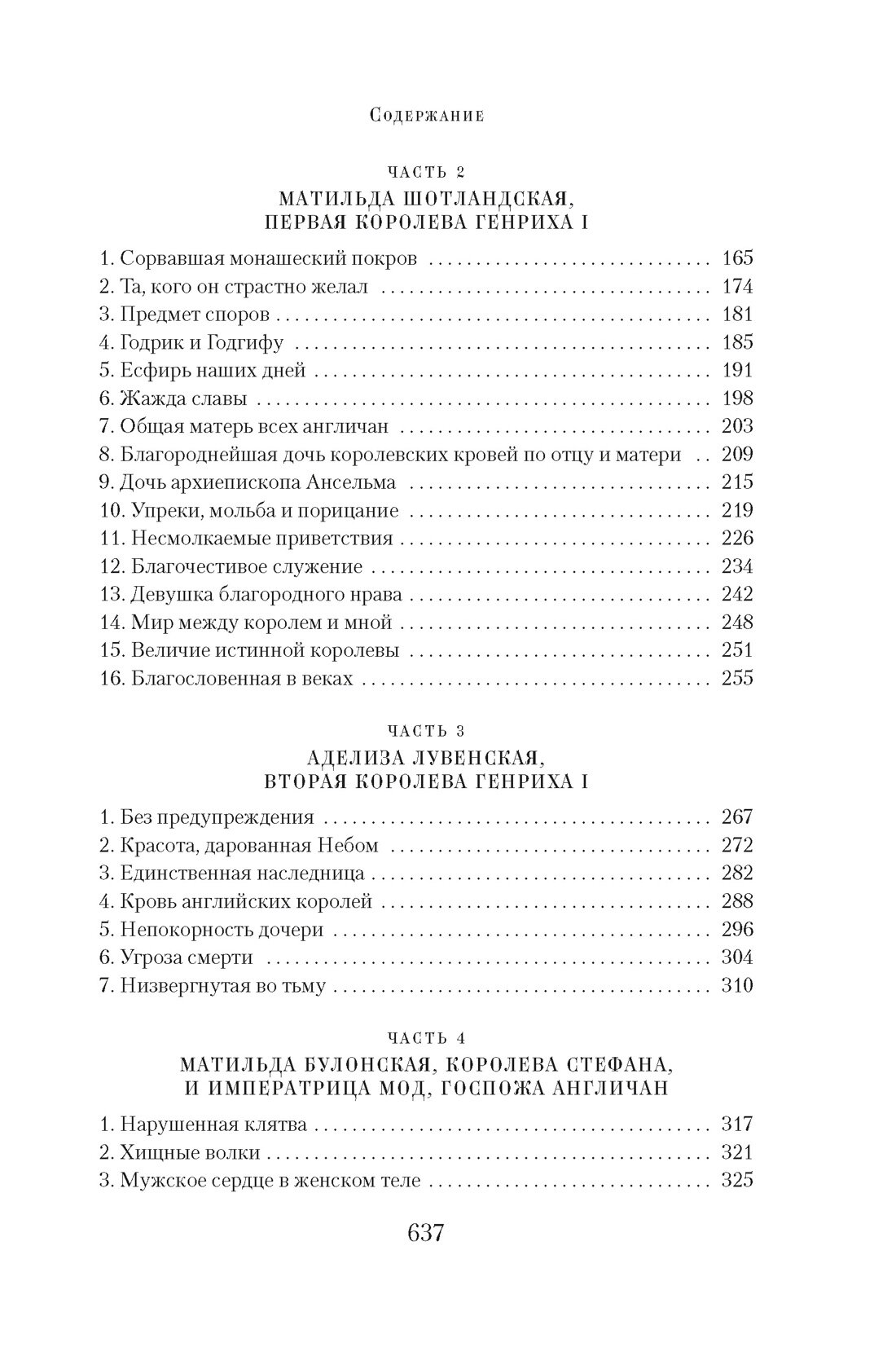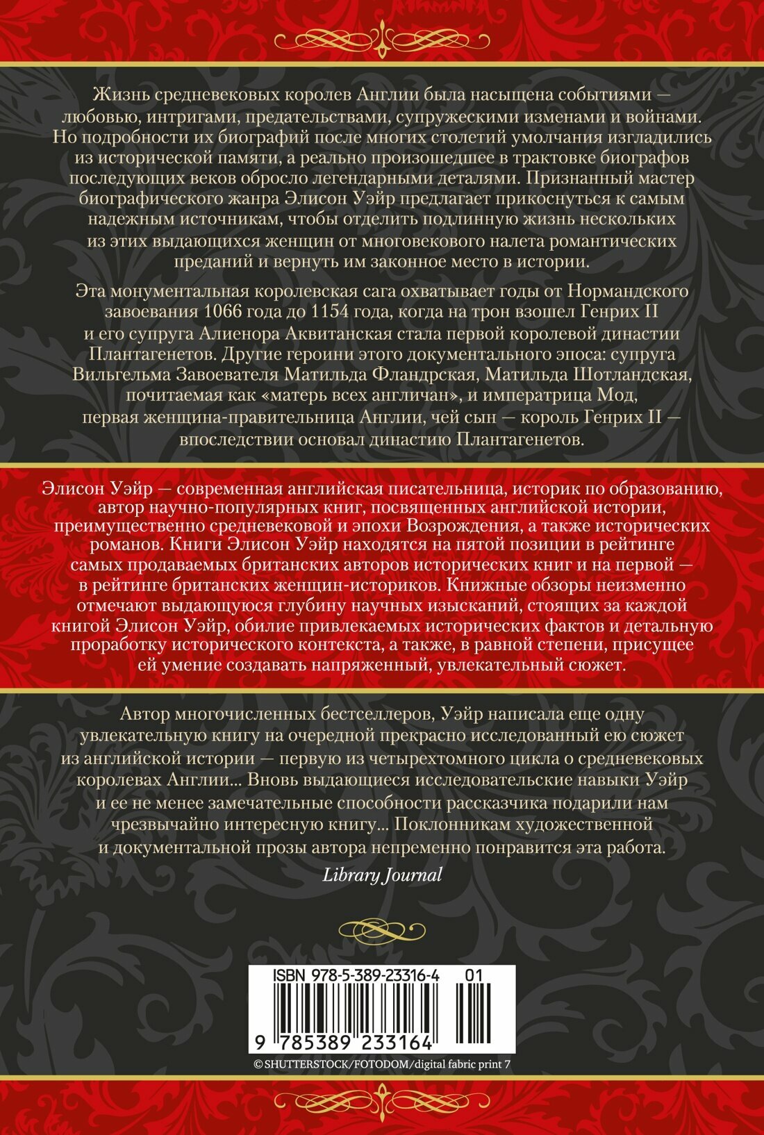 Жизнь средневековых королев Англии была насыщена событиями — любовью, интригами, предательствами, супружескими изменами и войнами. Но подробности их биографий после многих столетий умолчания изгладились из исторической памяти, а реально произошедшее в трактовке биографов последующих веков обросло легендарными деталями. Признанный мастер биографического жанра Элисон Уэйр предлагает прикоснуться к самым надежным источникам, чтобы отделить подлинную жизнь нескольких из этих выдающихся женщин от многовекового налета романтических преданий и вернуть им законное место в истории. Эта монументальная королевская сага охватывает годы от Нормандского завоевания 1066 года до 1154 года, когда на трон взошел Генрих II и его супруга Алиенора Аквитанская стала первой королевой династии Плантагенетов. Другие героини этого документального эпоса: супруга Вильгельма Завоевателя Матильда Фландрская, Матильда Шотландская, почитаемая как «матерь всех англичан», и императрица Мод, первая женщина-правительница Англии, чей сын — король Генрих II — впоследствии основал династию Плантагенетов.