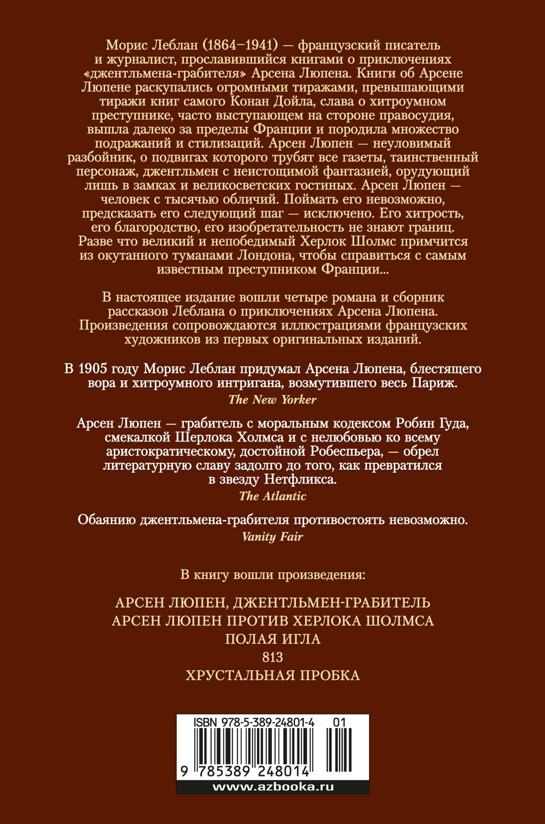 Книги французского писателя Мориса Леблана о приключениях Арсена Люпена раскупались при жизни автора огромными тиражами, превышающими тиражи книг самого Конан Дойла. Кто же такой этот Арсен Люпен? Арсен Люпен — неуловимый грабитель, о подвигах которого трубят все газеты, таинственный персонаж, джентльмен с неистощимой фантазией, орудующий лишь в замках и великосветских гостиных. Арсен Люпен — человек с тысячью обличий. Поймать его невозможно, предсказать его следующий шаг — исключено. Его хитрость, его благородство, его изобретательность не знают границ. Разве что великий и непобедимый Херлок Шолмс примчится из окутанного туманами Лондона, чтобы справиться с самым известным преступником Франции… В настоящее издание вошли четыре романа и сборник рассказов Леблана о приключениях Арсена Люпена. Произведения сопровождаются иллюстрациями французских художников из первых оригинальных изданий.