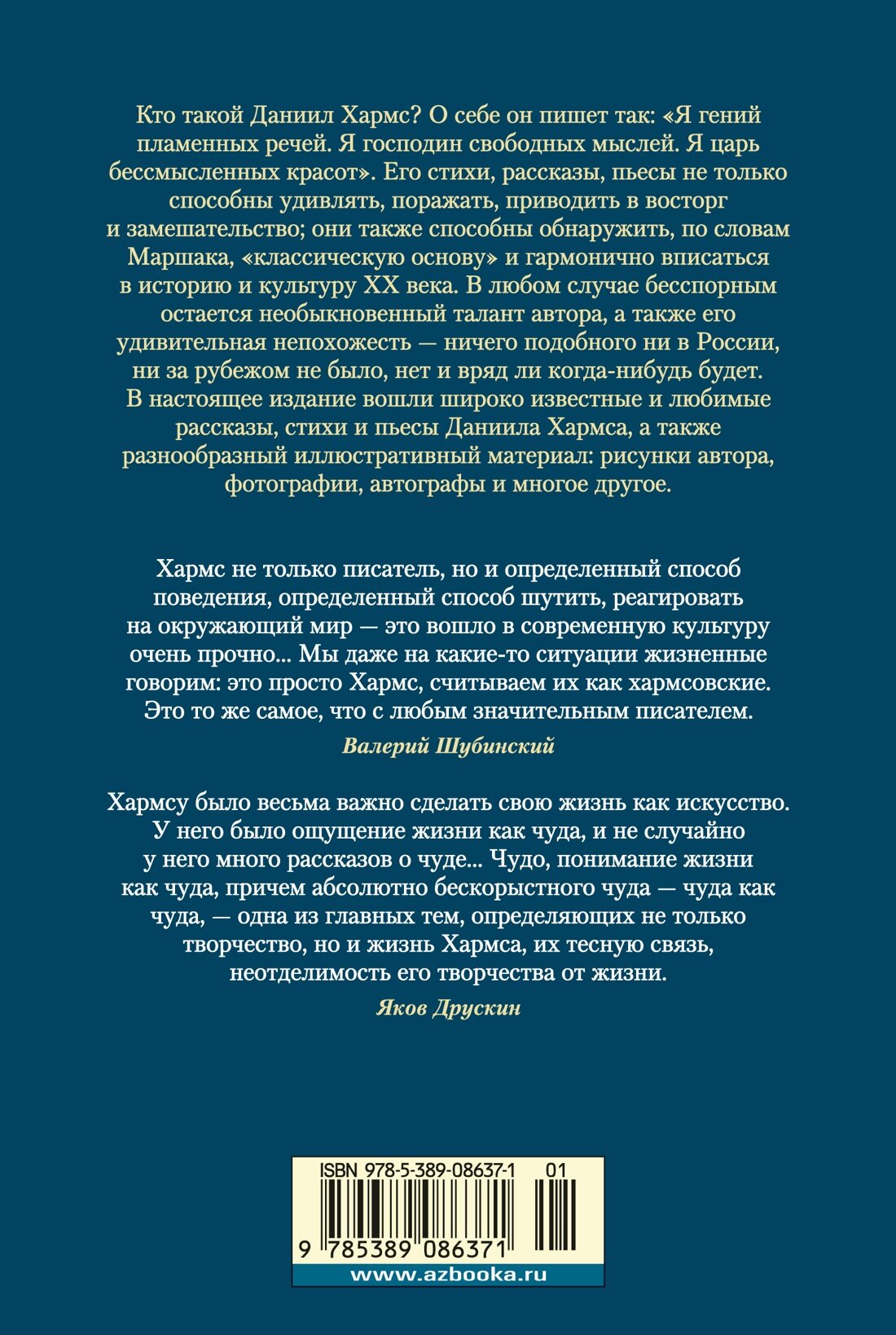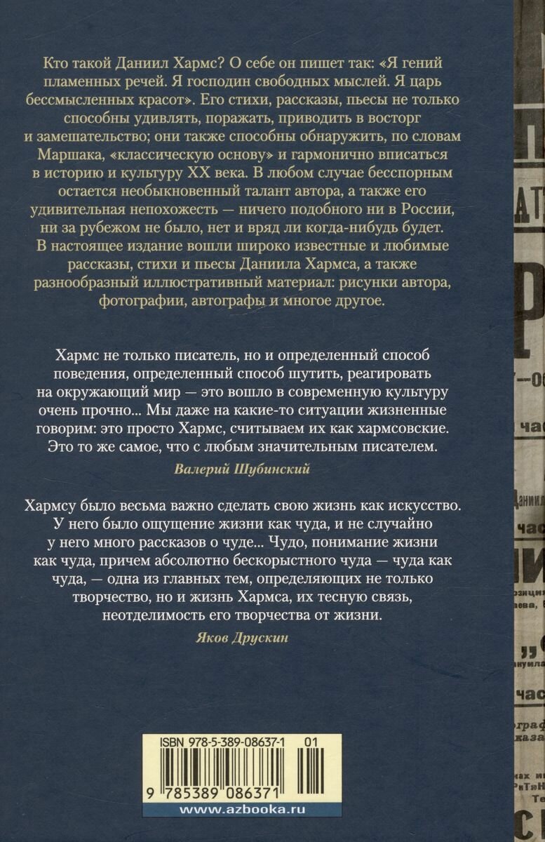Кто такой Даниил Хармс? О себе он пишет так: «Я гений пламенных речей. Я господин свободных мыслей. Я царь бессмысленных красот». Его стихи, рассказы, пьесы не только способны удивлять, поражать, приводить в восторг и замешательство; они также способны обнаружить, по словам Маршака, «классическую основу» и гармонично вписаться в историю и культуру ХХ века. В любом случае бесспорным остается необыкновенный талант автора, а также его удивительная непохожесть — ничего подобного ни в России, ни за рубежом не было, нет и вряд ли когда-нибудь будет. В настоящее издание вошли широко известные и любимые рассказы, стихи и пьесы Даниила Хармса, а также разнообразный иллюстративный материал: рисунки автора, фотографии, автографы и многое другое.