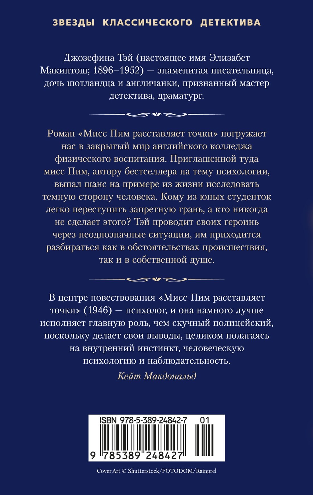 Джозефина Тэй (настоящее имя — Элизабет Макинтош; 1896–1952) — знаменитая писательница, дочь шотландца и англичанки, признанный мастер британского детектива. Роман «Мисс Пим расставляет точки» (1946) погружает нас в закрытый мир английского колледжа физического воспитания. Приглашенной туда мисс Пим, автору бестселлера на тему психологии, выпал шанс на примере из жизни исследовать темную сторону человека. Кому из юных студенток легко переступить запретную грань, а кто никогда не сделает этого? Тэй проводит своих героинь через неоднозначные ситуации, им приходится разбираться как в обстоятельствах происшествия, так и в собственной душе.