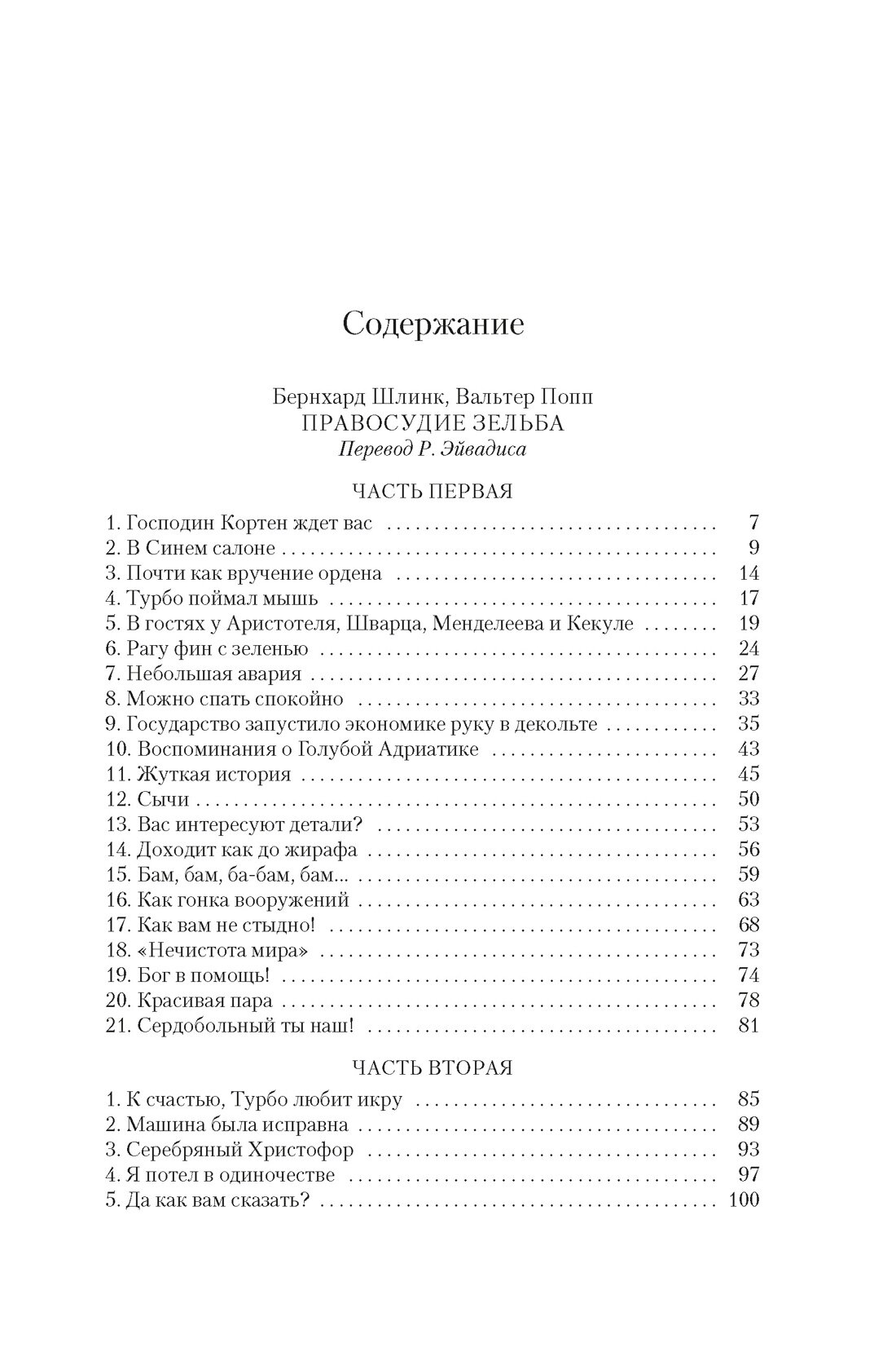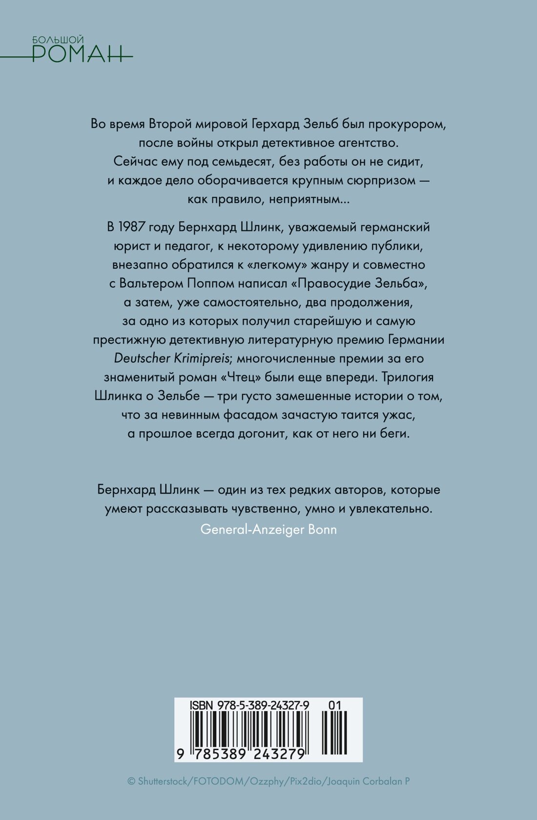 Во время Второй мировой Герхард Зельб был прокурором, после войны открыл детективное агентство. Сейчас ему под семьдесят, без работы он не сидит, и каждое дело оборачивается крупным сюрпризом — как правило, неприятным. Друг детства просит расследовать хакерские атаки — и Зельбу, который ничего не смыслит в компьютерах, зато неплохо разбирается в людях, открывается мрачная тайна прошлого, которой лучше бы так и остаться тайной. Неизвестный заказчик бесцеремонно требует найти пропавшую девушку, якобы его дочь, — и Зельб ввязывается в бешеную гонку, где будут терроризм, фантомные и реальные пожары, предательства, ложь и безумие. Случайное знакомство с банкиром приносит вроде бы необременительный заказ — найти тайного компаньона банка, — и внезапно люди гибнут неведомо отчего, раскрываются финансовые махинации, из мутных глубин всплывает мафия, кого-то похищают, врут все, в дверь то и дело стучится потрепанный судьбой человек с нежданной вестью, и все это всерьез угрожает здоровью Зельба. Такую жизнь было бы непросто вынести, не будь Зельб в избытке наделен обаянием, самоиронией, решимостью прирожденной ищейки, а также дружбой людей, готовых поддержать в самой странной ситуации... В 1987 году Бернхард Шлинк, уважаемый юрист и педагог, к некоторому удивлению публики, внезапно обратился к «легкому» жанру и совместно с Вальтером Поппом написал «Правосудие Зельба», а затем, уже самостоятельно, два продолжения, за одно из которых получил старейшую и самую престижную детективную литературную премию Германии Deutscher Krimipreis; многочисленные премии за его знаменитый роман «Чтец» были еще впереди. Трилогия Шлинка о Зельбе — три густо замешенные истории о том, что за невинным фасадом зачастую таится ужас, а прошлое всегда догонит, как от него ни беги.