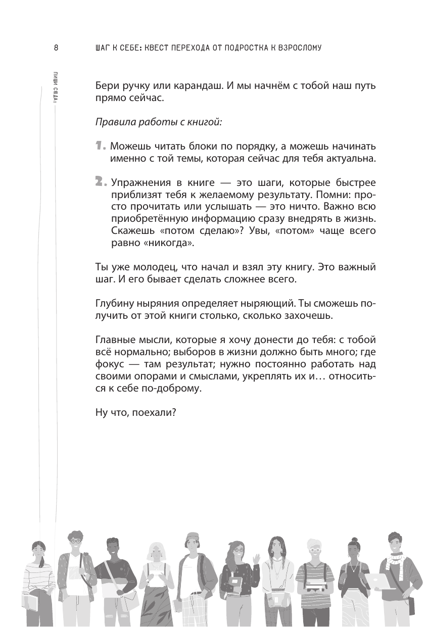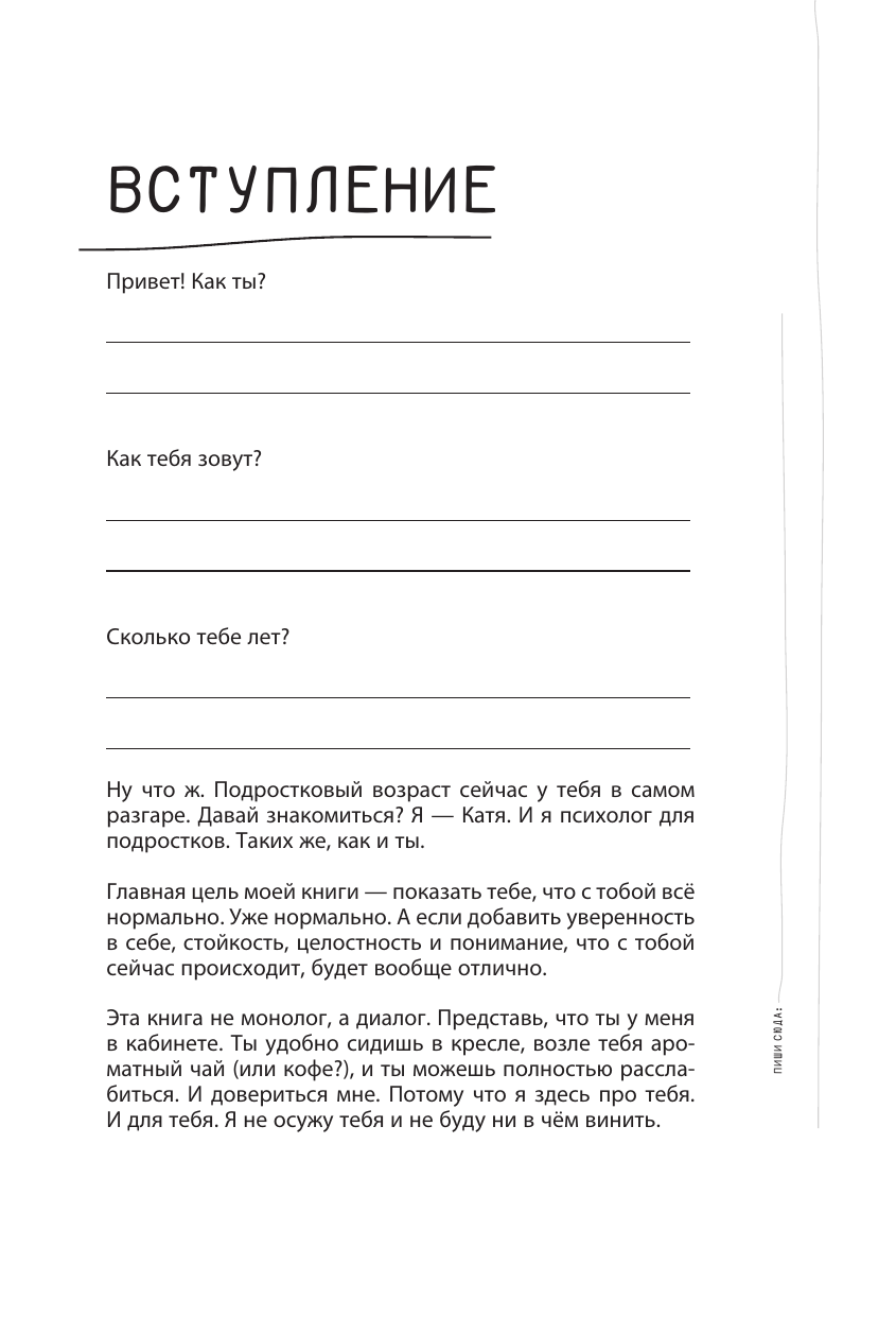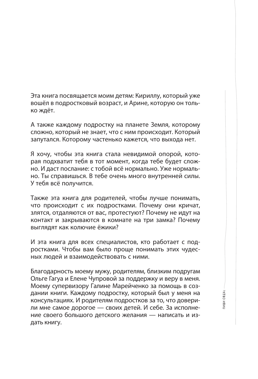 Когда проблемы подросткового возраста накрывают с головой, кажется, что они никогда не решатся. И переход от ребёнка к взрослому выглядит как настоящий квест с препятствиями. Эта книга станет твоей невидимой опорой, которая поддержит тебя, поможет лучше узнать себя, а главное, даст понять: с тобой всё нормально! Не переживай, если не умеешь справляться с трудностями подросткового возраста — книга научит тебя чётко анализировать проблемы и находить их решения. Вопросы для самоанализа, упражнения и советы помогут тебе держаться на плаву, научат лучше понимать себя и окружающих. Отправься в лучшую, осознанную жизнь. А каким будет твой путь — решать тебе!
