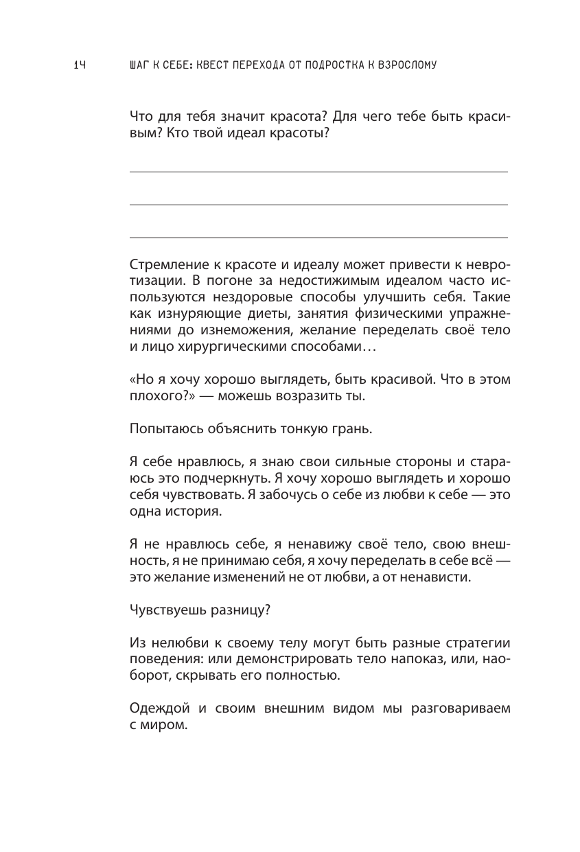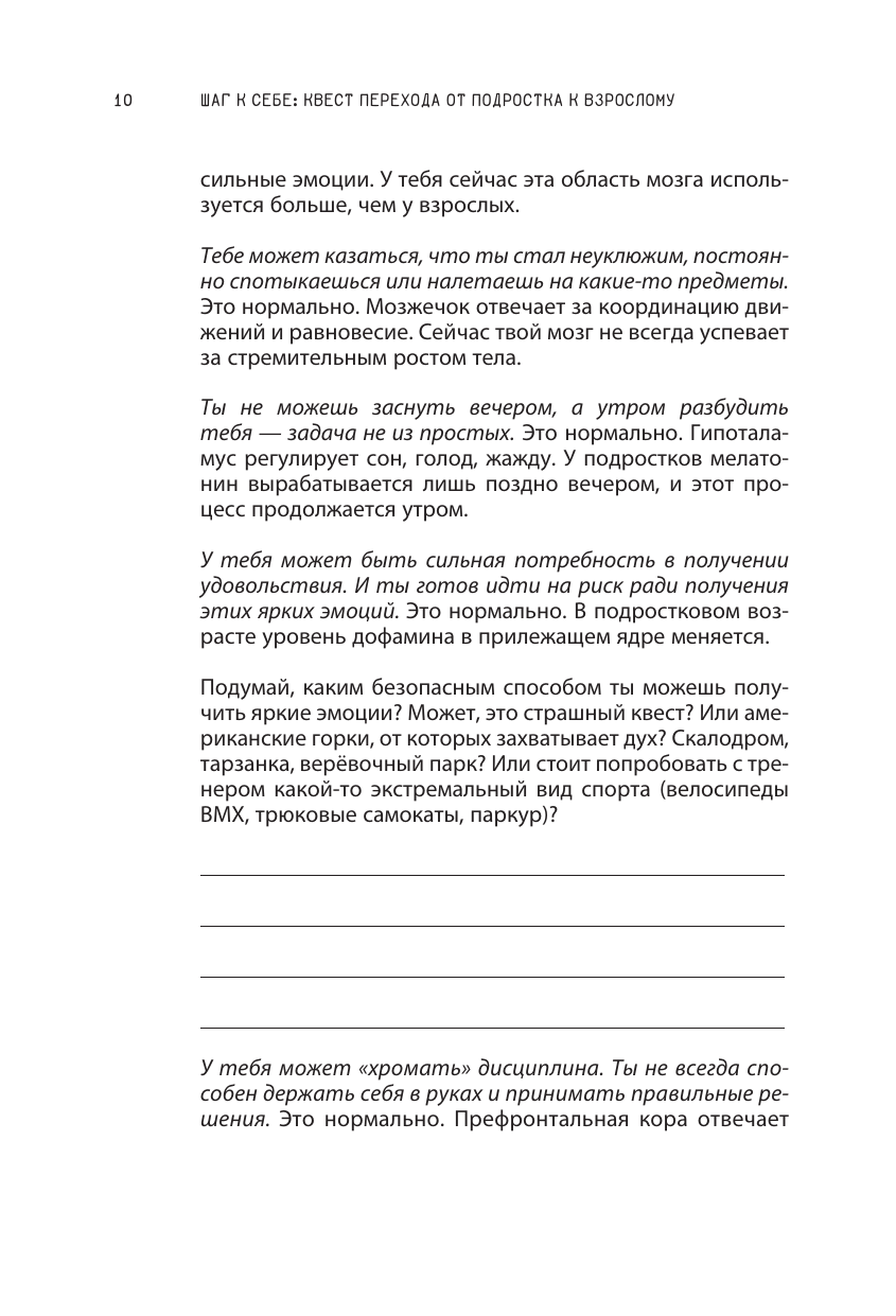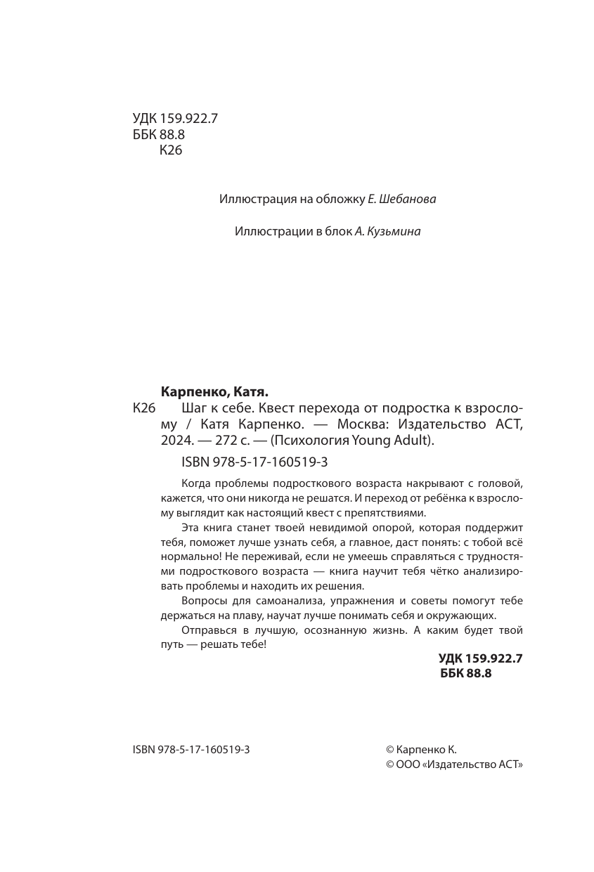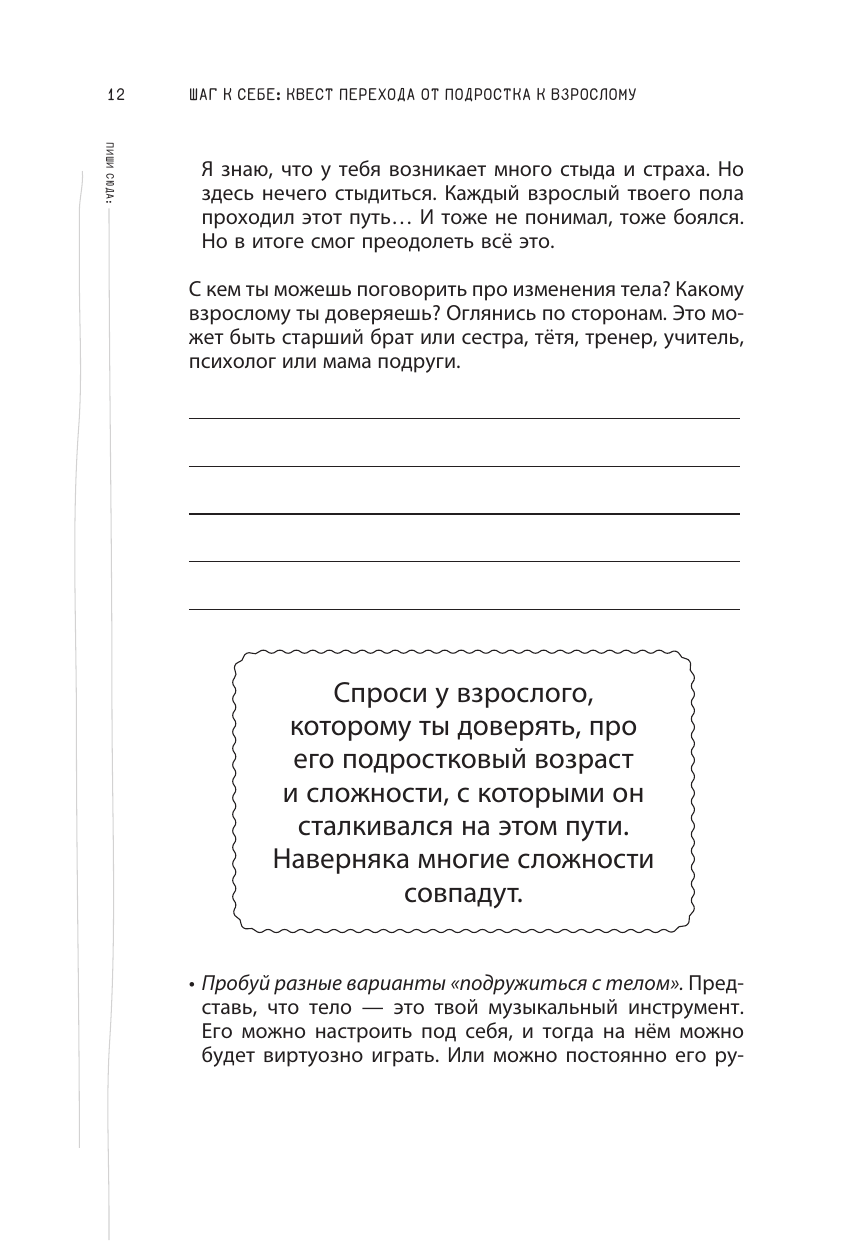 Когда проблемы подросткового возраста накрывают с головой, кажется, что они никогда не решатся. И переход от ребёнка к взрослому выглядит как настоящий квест с препятствиями. Эта книга станет твоей невидимой опорой, которая поддержит тебя, поможет лучше узнать себя, а главное, даст понять: с тобой всё нормально! Не переживай, если не умеешь справляться с трудностями подросткового возраста — книга научит тебя чётко анализировать проблемы и находить их решения. Вопросы для самоанализа, упражнения и советы помогут тебе держаться на плаву, научат лучше понимать себя и окружающих. Отправься в лучшую, осознанную жизнь. А каким будет твой путь — решать тебе!