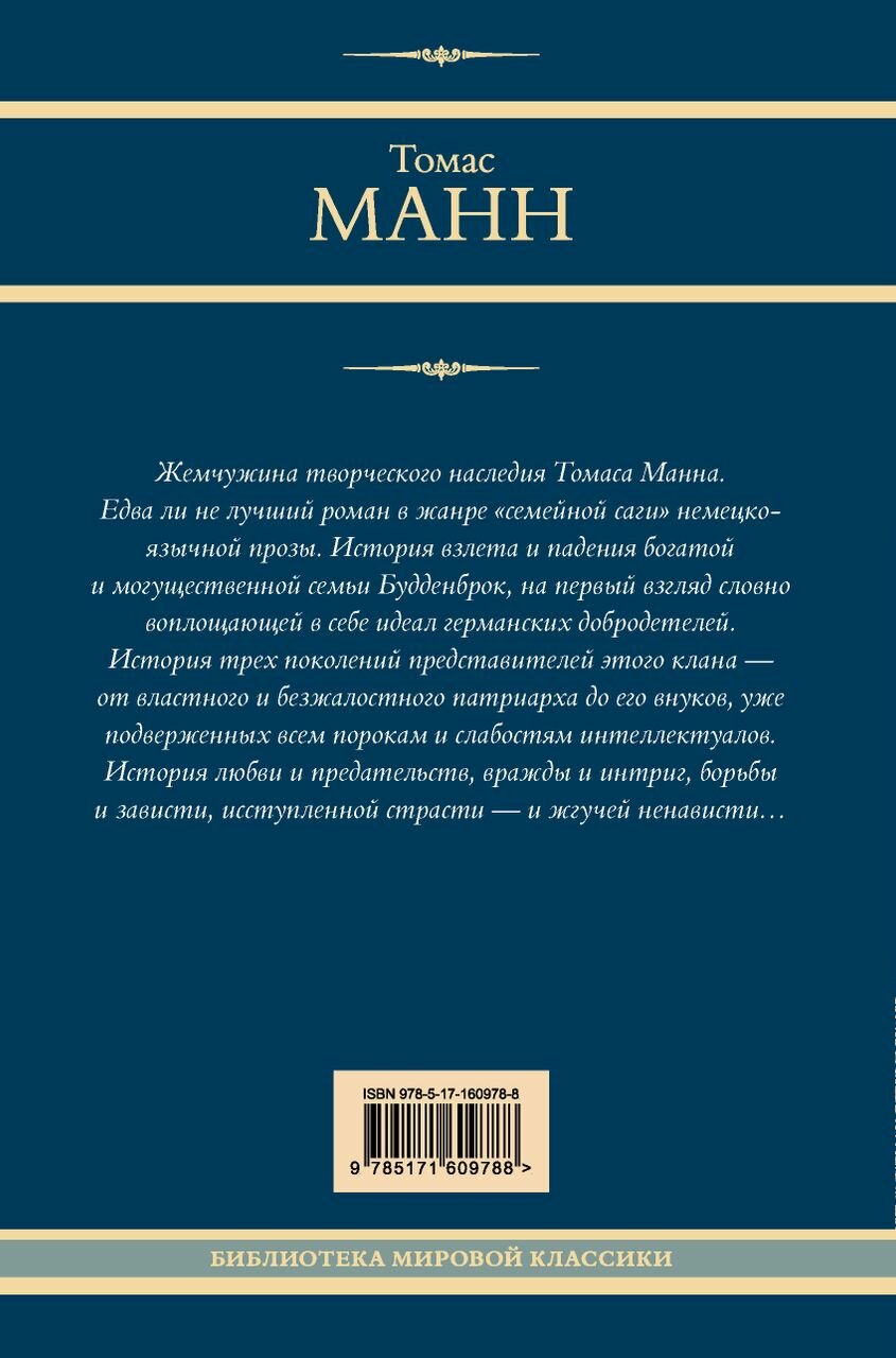 Жемчужина творческого наследия Томаса Манна. Едва ли не лучший роман в жанре «семейной саги» немецкоязычной прозы. История взлета и падения богатой и могущественной семьи Будденброк, на первый взгляд словно воплощающей в себе идеал германских добродетелей. История трех поколений представителей этого клана — от властного и безжалостного патриарха до его внуков, уже подверженных всем порокам и слабостям интеллектуалов. История любви и предательств, вражды и интриг, борьбы и зависти, исступленной страсти — и жгучей ненависти…