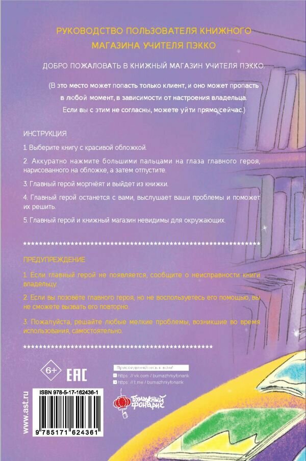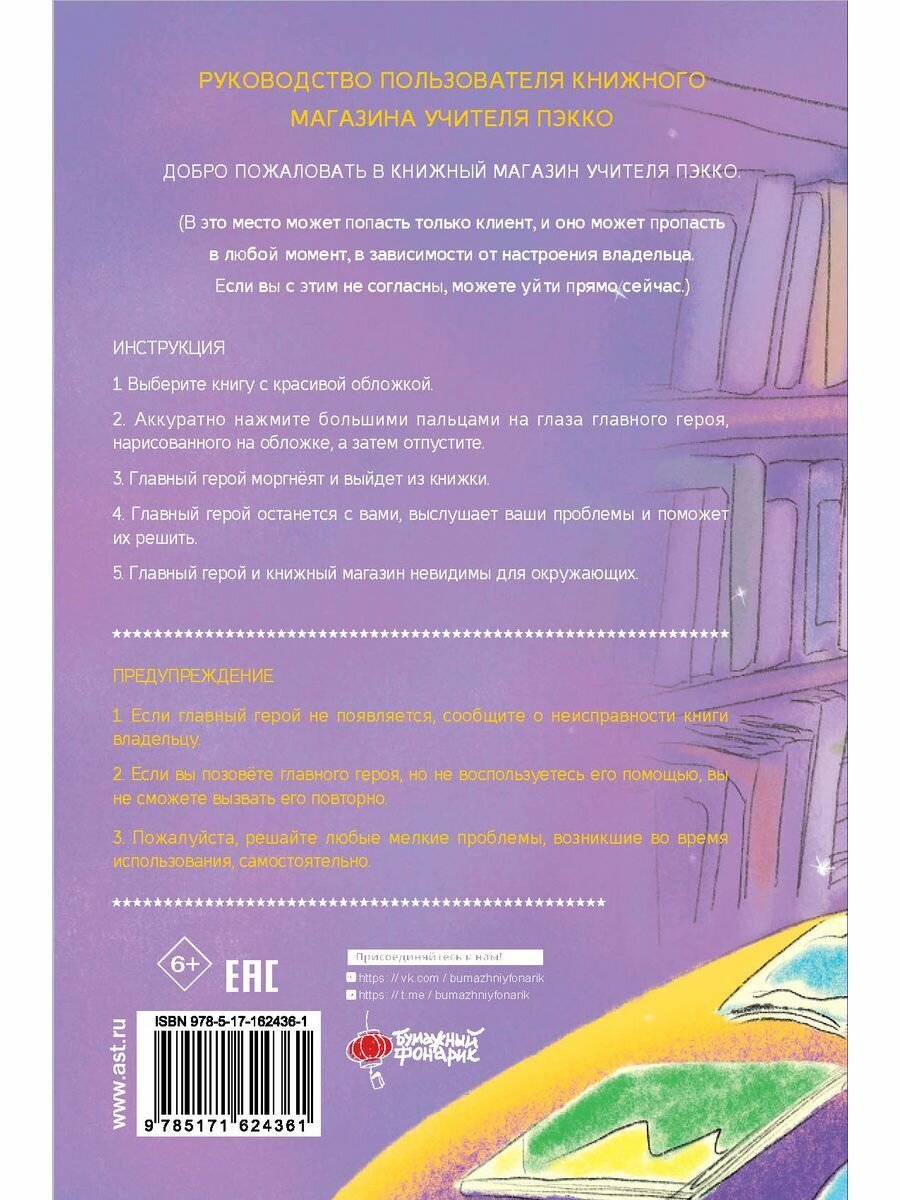 РУКОВОДСТВО ПОЛЬЗОВАТЕЛЯКНИЖНОГО МАГАЗИНАУЧИТЕЛЯ ПЭККОДОБРО ПОЖАЛОВАТЬ В КНИЖНЫЙ МАГАЗИН УЧИТЕЛЯ ПЭККО.(В это место может попасть только клиент, и оно может пропасть в любой момент, в зависимости от настроения владельца. Если вы с этим не согласны, можете уйти прямо сейчас.)ИНСТРУКЦИЯ:1. Выберите книгу с красивой обложкой.2. Аккуратно нажмите большим пальцем на глаза главного героя, нарисованного на обложке, а затем отпустите. 3. Главный герой моргнет и выйдет из книжки.4. Главный герой останется с вами, выслушает ваши проблемы и поможет их решить.4. Главный герой и книжная комната невидимы для окружающих.ПРЕДУПРЕЖДЕНИЕ:1. Если главный герой не появляется, сообщите о не¬исправности книги владельцу. 2. Если вы позовёте главного героя, но не воспользуе¬тесь его помощью, вы не сможете вызвать его повторно.3. Пожалуйста, решайте любые мелкие проблемы, возникшие во время использования, самостоятельно.