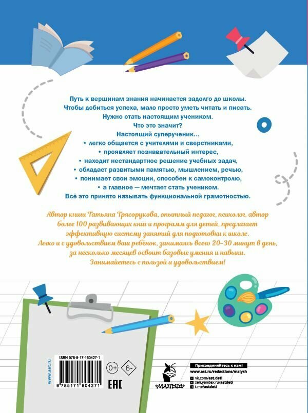 Важность подготовить ребенка к школе понимают все родители. Но как это сделать максимально эффективно и не отбить у малыша желание учиться? Уметь читать, писать, считать сейчас недостаточно! В этой книге Татьяна Трясорукова, опытный педагог, психолог, автор более 100 книг и развивающих программ, подготовила увлекательные задания, которые помогут увеличить словарный запас, сформируют социальный и эмоциональный интеллект, улучшат зрительно-моторную координацию, позволят развить творческий потенциал, внимание и память. Все эти навыки принято называть функциональной грамотностью. Именно от нее в первую очередь зависит успешность первых лет обучения в школе. Задания сопровождаются подсказками для родителей. Занимайтесь с пользой и удовольствием! Для дошкольного возраста.