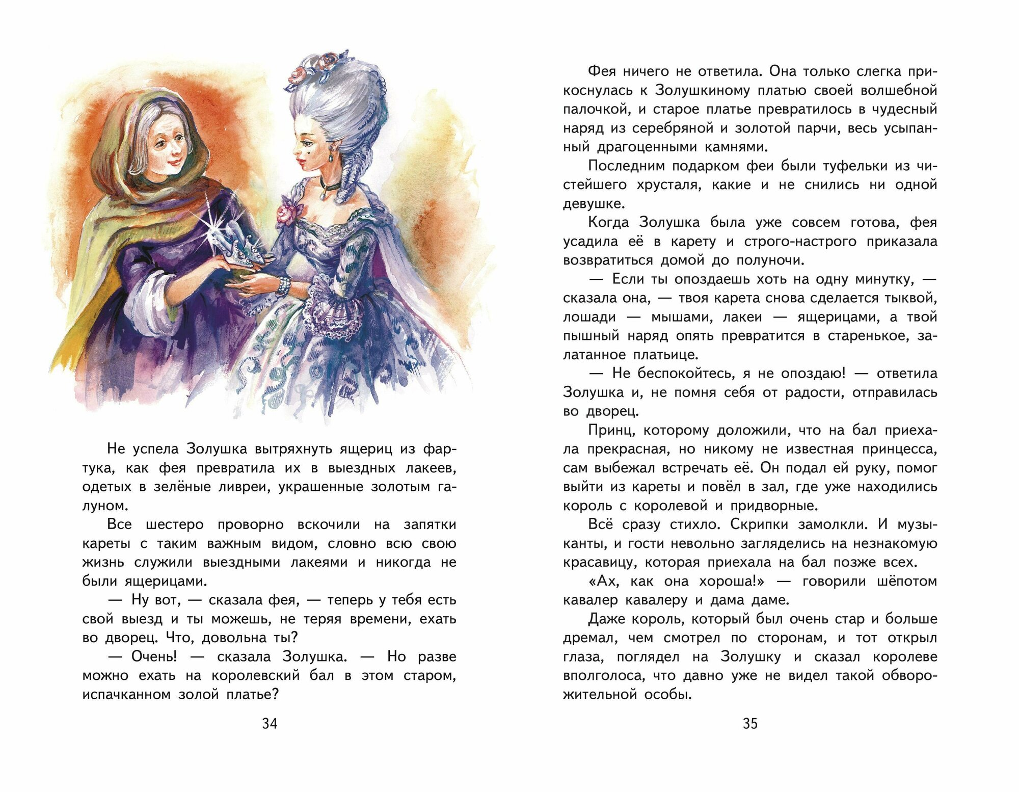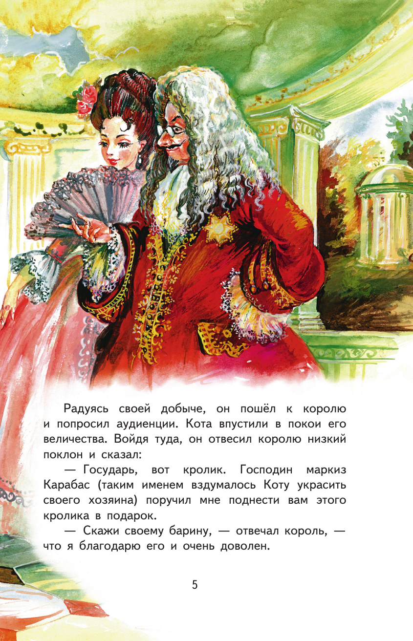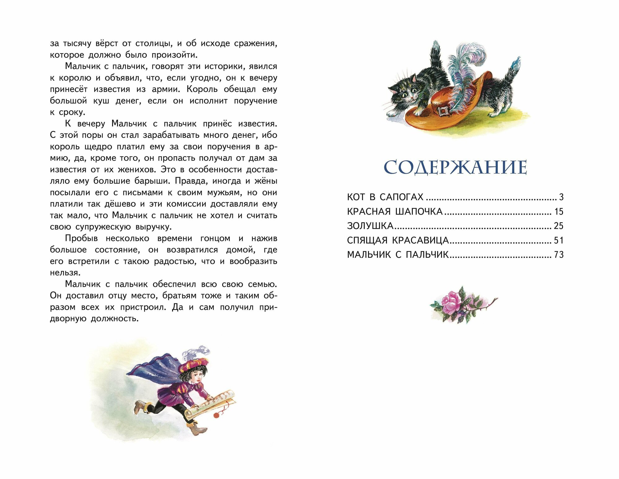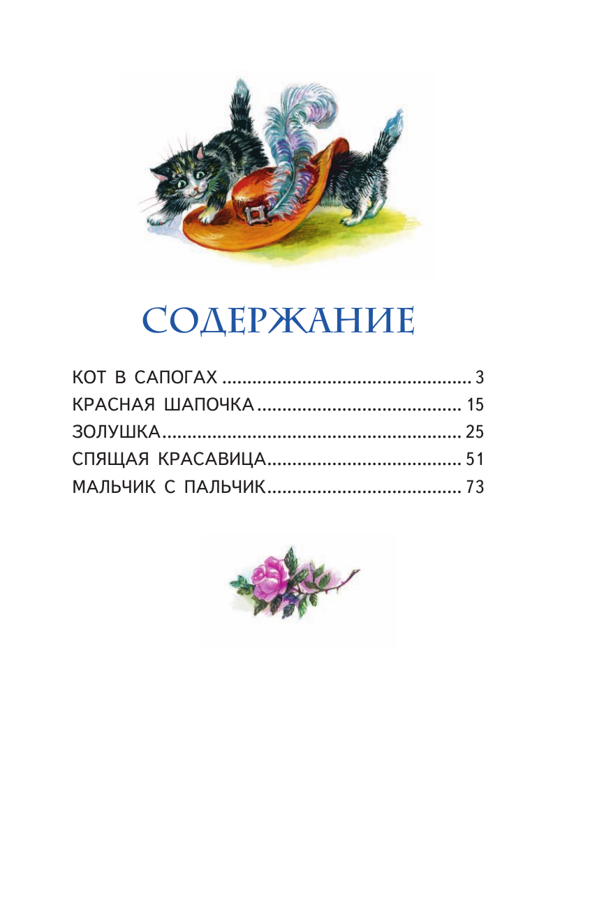 В этом сборнике с самыми известными сказками Шарля Перро хитрый Кот в сапогах помогает своему хозяину стать настоящим маркизом («Кот в сапогах»), маленькая Красная Шапочка спешит в гости к любимой бабушке («Красная Шапочка»), трудолюбивая Золушка готовится к своему первому балу («Золушка»), мечтательная Спящая красавица прокалывает свой палец заколдованным веретеном («Спящая красавица»), а умный Мальчик-с-пальчик выводит из тёмного леса своих братьев («Мальчик-с-пальчик»).