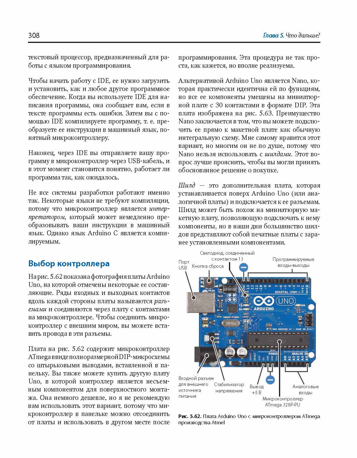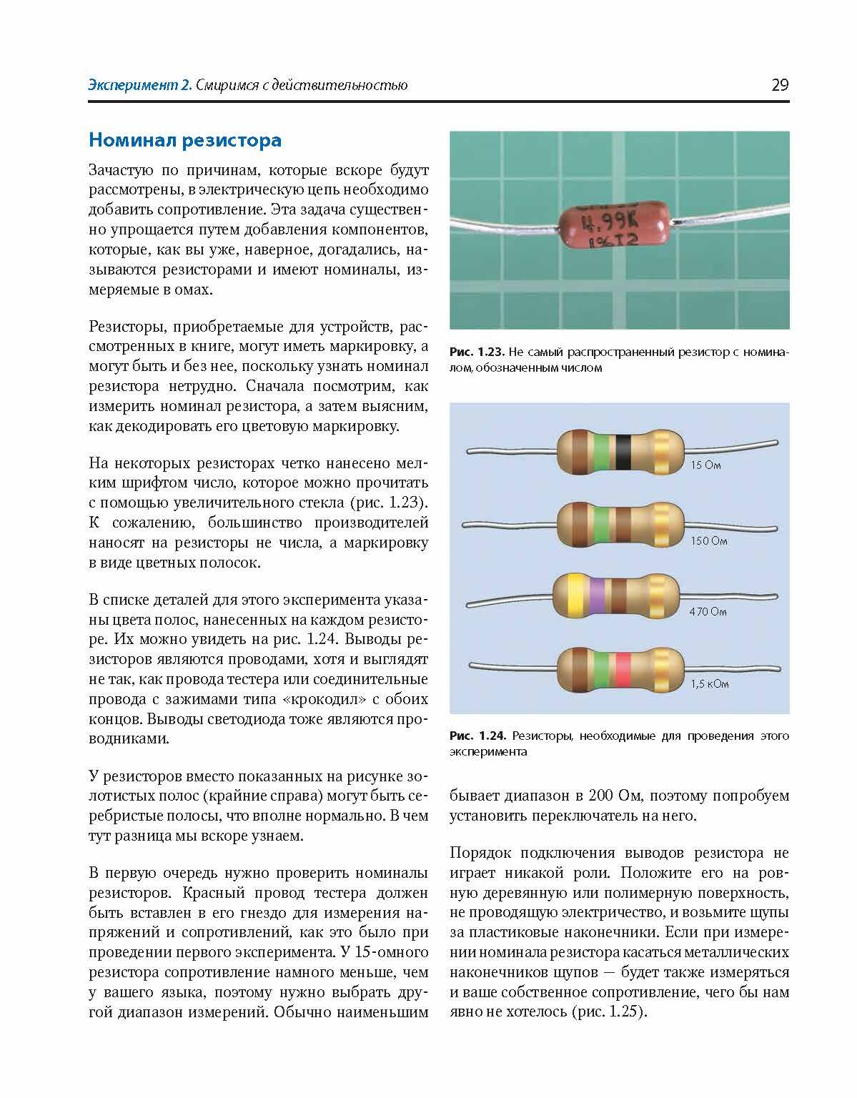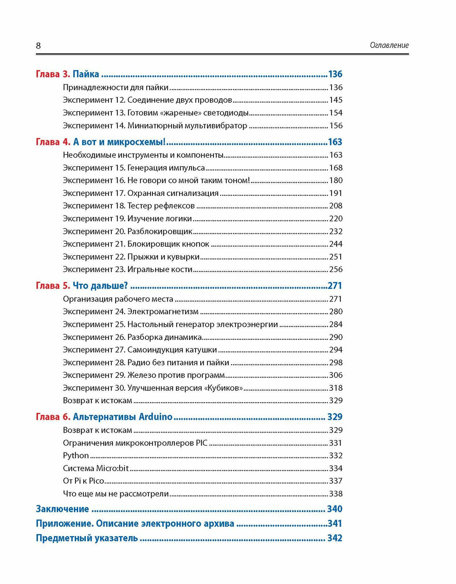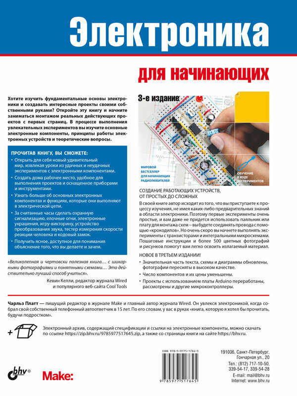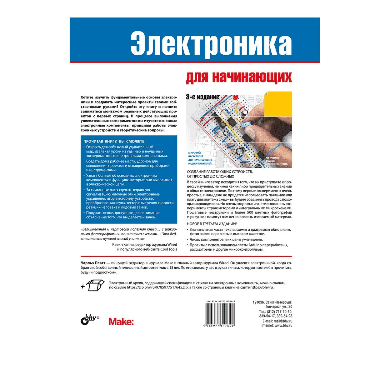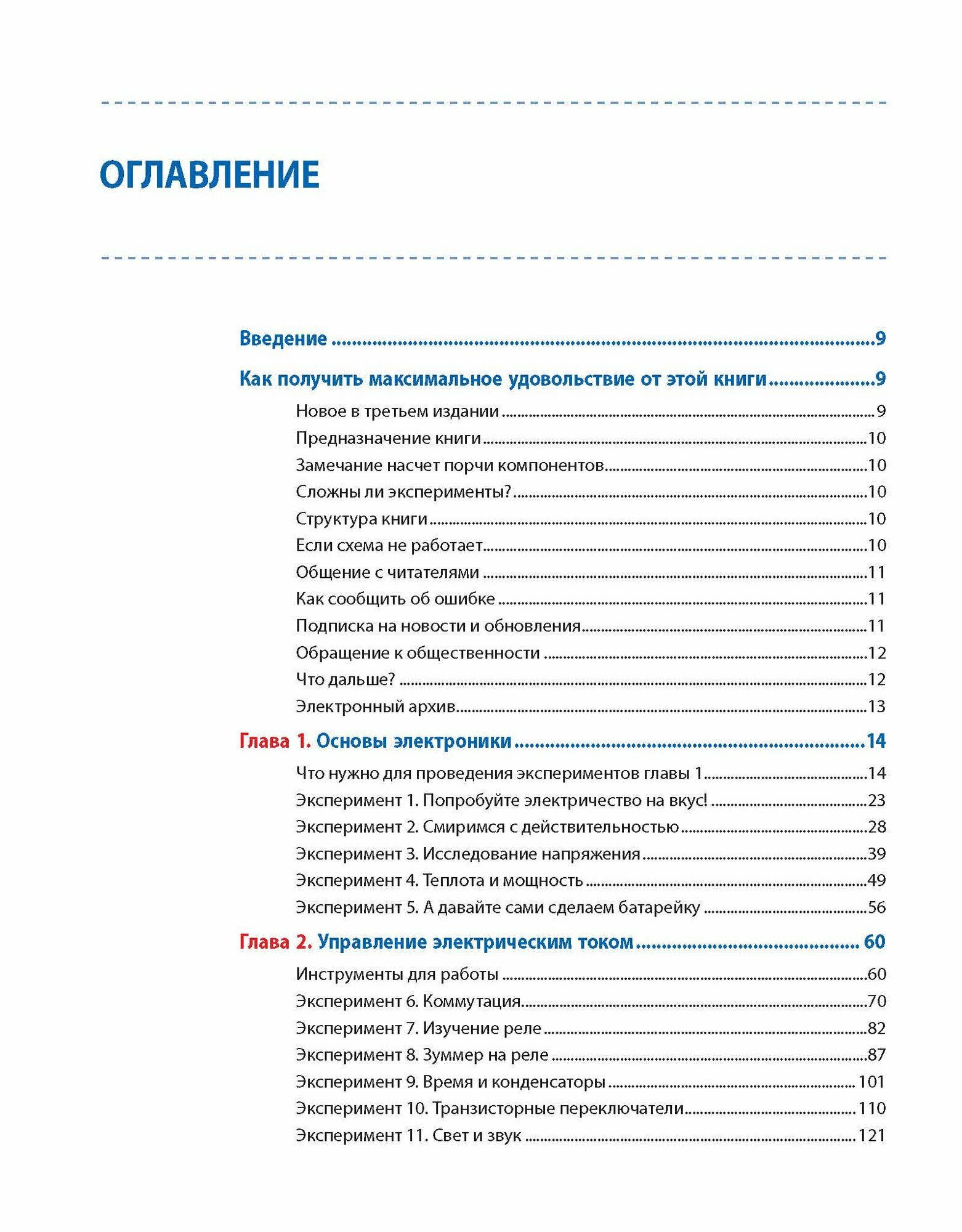 В ходе практических экспериментов рассмотрены основы электроники и показано, как проектировать, отлаживать и изготавливать электронные устройства в домашних условиях. Материал излагается последовательно от простого к сложному, начиная с простых опытов с электрическим током и заканчивая созданием сложных устройств с использованием транзисторов и микроконтроллеров. Описаны основные законы электроники, а также принципы функционирования различных электронных компонентов. Показано, как изготовить охранную сигнализацию, елочные огни, электронные украшения, устройство преобразования звука, кодовый замок и др. Приведены пошаговые инструкции и более 500 наглядных рисунков и фотографий. В третьем полноцветном издании значительная часть текста, схемы и диаграммы обновлены, фотографии пересняты в высоком качестве; число компонентов и их цена уменьшены; проекты с использованием платы Arduino переработаны, рассмотрены и другие микроконтроллеры.