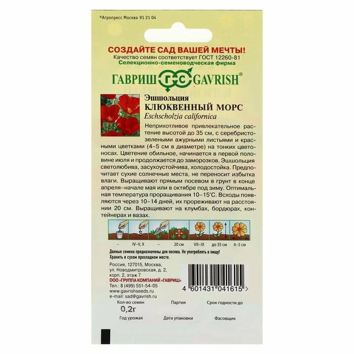 Сервис сравнения цен СкидкаГИД предлагает сравнить цены на товар «Семена цветов Эшшольция Клюквенный морс 02 г (комплект из 80 шт) ГАВРИШ»
