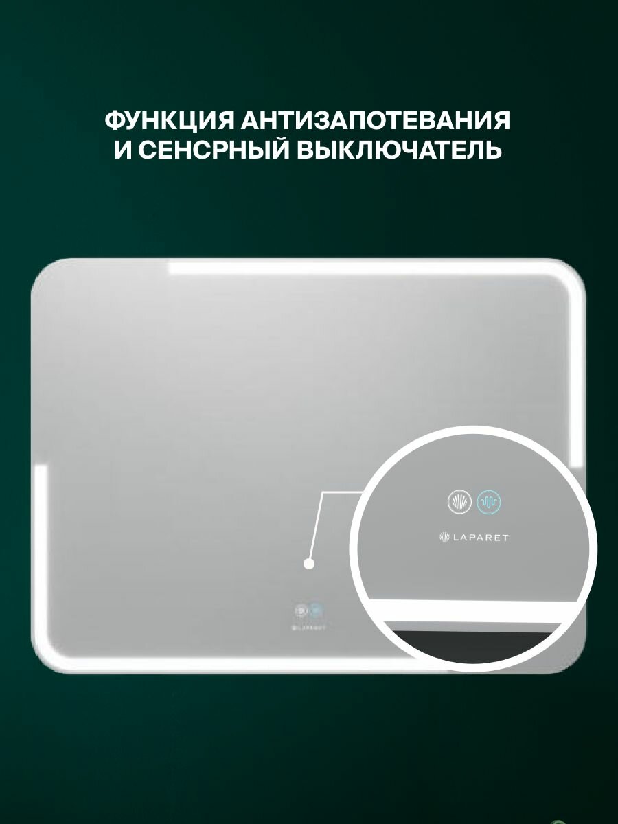 Зеркало настенное в ванную с подстветкой Electra 90*110 настенное с подсветкой в ванную влагостойкое станет стильным современным акцентом в Вашей ванной комнате. Прямоугольное зеркало с диммерной LED подсветкой энергосберегающее (блок управления мощностью - 36Вт с влагозащитой IP 56 - Степень защиты IP56 означает, что устройство имеет пылевлаго-защищенную конструкцию при которой некоторое количество пыли может проникать внутрь, однако это не нарушает работу устройства и защищено от сильных водяных струй. Вода, направляемая на корпус в виде сильных струй с любого направления, не должна оказывать вредного воздействия) Сенсорное включение/выключение изделия. Прямоугольное зеркало изготовлено из зеркального полотна толщиной до 6 мм.Зеркало с встроенной функцией антизапотевания - функцией подогрева, которая позволяет не запотевать зеркалу даже в условиях повышенной влажности (площадь подогрева 36*36). В комплект зеркала входят надежные крепления, которые просты в установке. Зеркало можно подключить к сети с помощью кабель-вилки или скрытым подключением. Срок гарантии на сантехническое изделие - 2 года. Изделие прошло обязательную сертификацию и может использоваться во влажных помещениях. Для работы на Вайлдберриз мы упаковываем все наши зеркала согласно всем требованиям перевозки хрупких изделий: 1-зеркало имеет защитную пленку на зеркальном полотне,2- изделие поставляется в полиэтиленовой упаковке, чтобы избежать попадания пыли или влаги 3 - зеркало защищено П-образным пенопластовым коробом; 4- зеркало поставляется в плотном картонном коробе, который помещен в деревянную обрешетку. 5- манипуляционный знак "осторожно хрупкое" так же расположен на коробе изделия. Мы являемся официальным магазином бренда Laparet. Приобретая продукцию в нашем магазине Вы можете быть уверены в качестве продукции и гарантии Производителя. По вопросам гарантийного или пост гарантийного обслуживания Вы можете обратиться в компанию Гидровид - официальный сервисный центр Laparet.