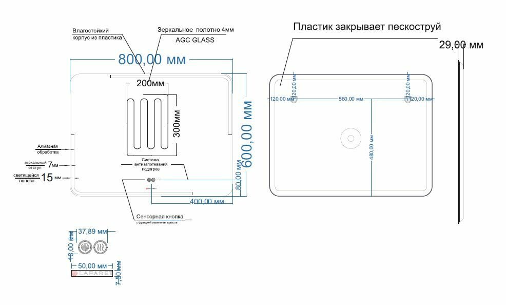 | Оснащение зеркала | регулируемая подсветка |