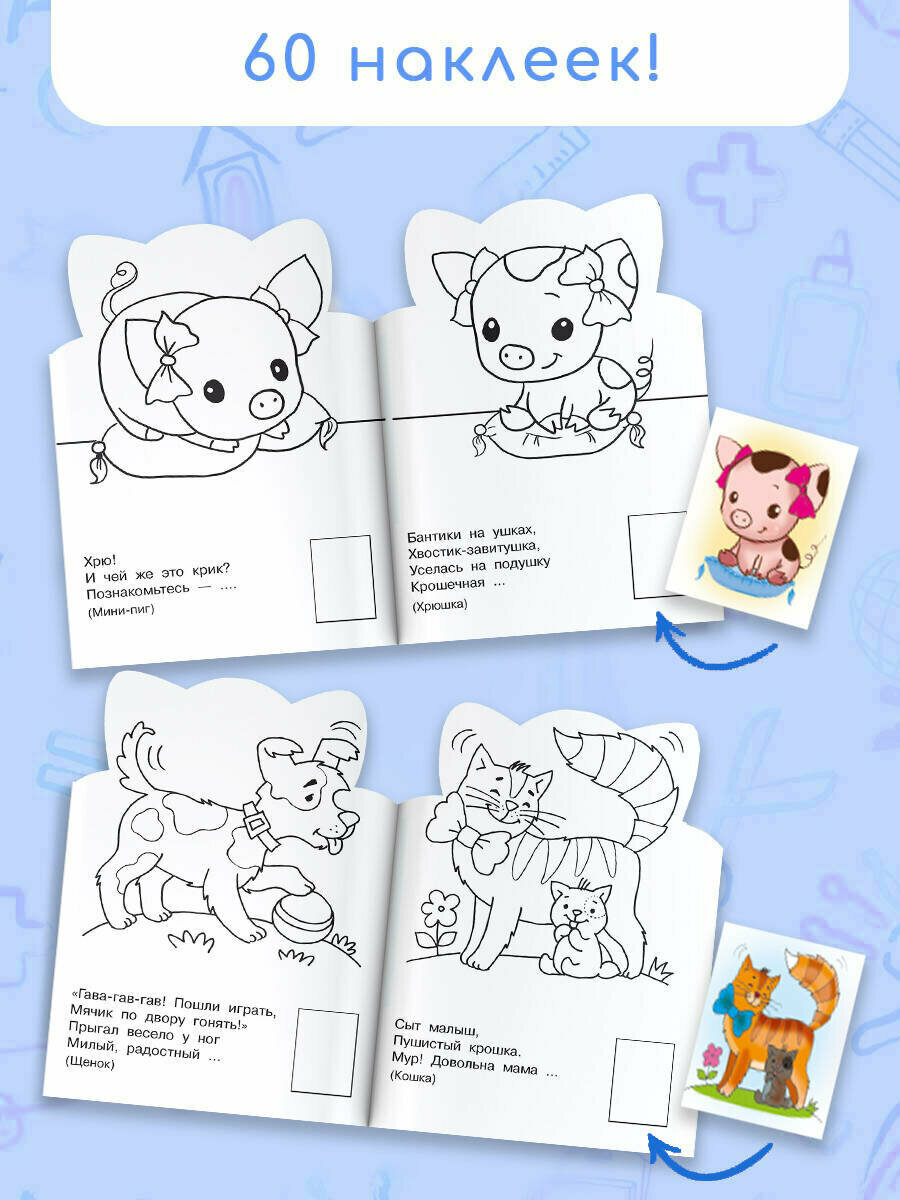 «Домашние животные» — замечательная книжка с наклейками и фигурной вырубкой, которая поможет вам и вашему ребенку интересно и с пользой провести свободное время. Внутри обучающая раскраска + коллекция из красочных стикеров для знакомства со зверятами. Юного художника ждут крупные картинки с чётким контуром, красочные стикеры с животными. Благодаря использованию плотной бумаги, дети могут использовать различные материалы для рисования: карандаши, маркеры, краски или мелки. С первых мгновений ребёнок погрузится в процесс и уже не сможет оторваться от увлекательного мира творчества!Замечательная раскраска с фигурной вырубкой — это забавные картинки животных и коллекция чудесных красочных наклеек. Играя с книжкой «Домашние животные», ребёнок раскрашивает картинки, с удовольствием отгадывает загадки и подбирает подходящие наклейки. Интересные занятия развивают воображение, мелкую моторику рук, логическое и абстрактное мышление, память и речь. Раскрашивать забавные картинки на плотной белой бумаге можно цветными карандашами, карандашами, фломастерами, мелками, красками. Для дошкольного возраста.