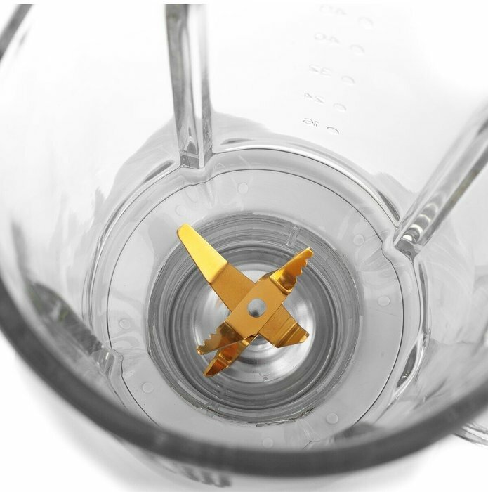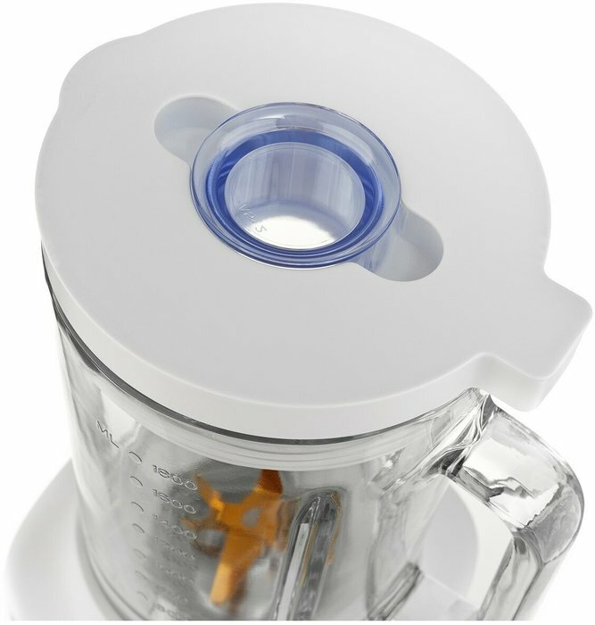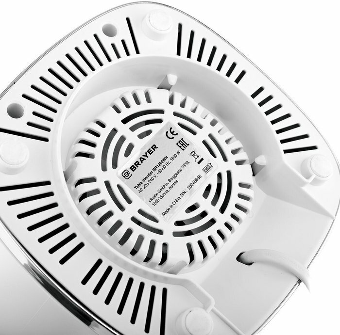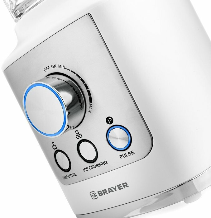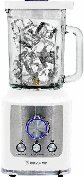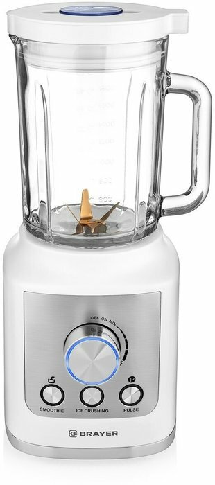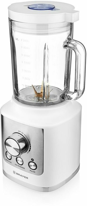 Стационарный блендер Brayer BR1200WH мощностью 1800 Вт оснащен тремя скоростями и тремя режимами работы (измельчение льда, импульсный, смузи). Прибор запускается плавно, переключатель скоростей и кнопки управления режимами расположены на верхней части корпуса. Измельчение осуществляется с помощью ножа с шестью лезвиями (титановое покрытие). Емкость кувшина из стекла составляет 1,8 л, верхнее окно предназначено для добавки продуктов. Прибор не включится до момента полной сборки. Корпус блендера изготовлен из металла и пластика, прорезиненные ножки обеспечивают устойчивость на поверхности. Длина сетевого провода составляет 1 м, предусмотрено место в корпусе для хранения шнура. Вес блендера составляет 4,9 кг.