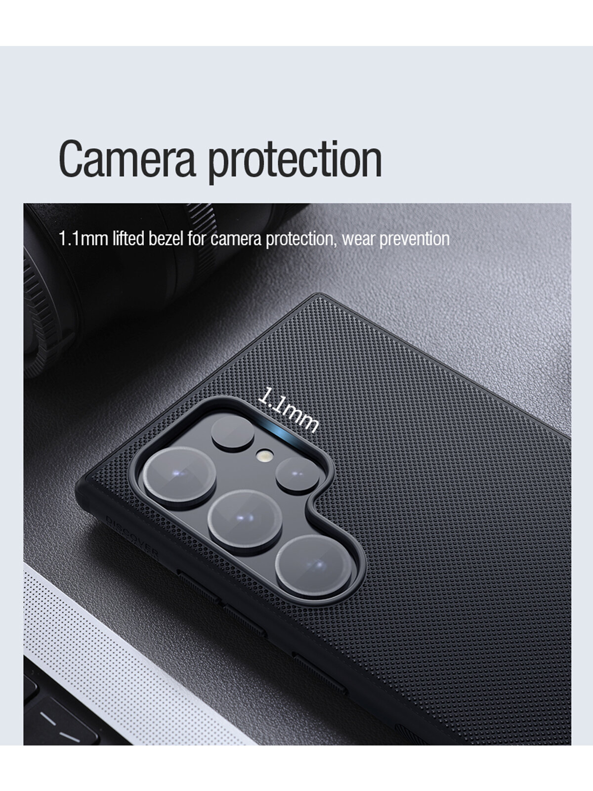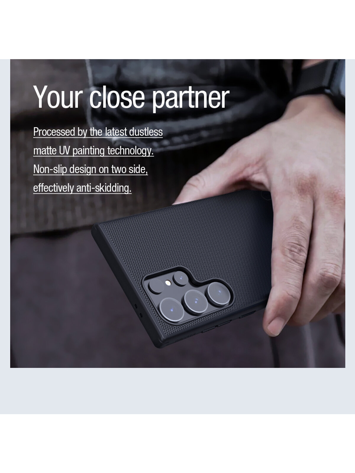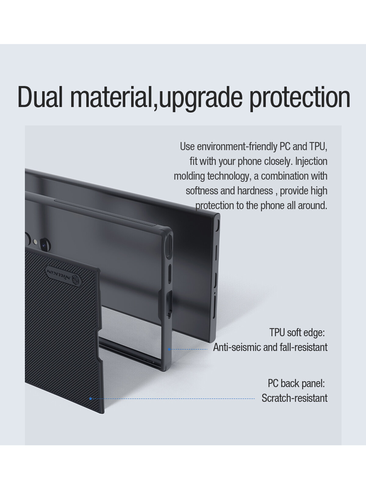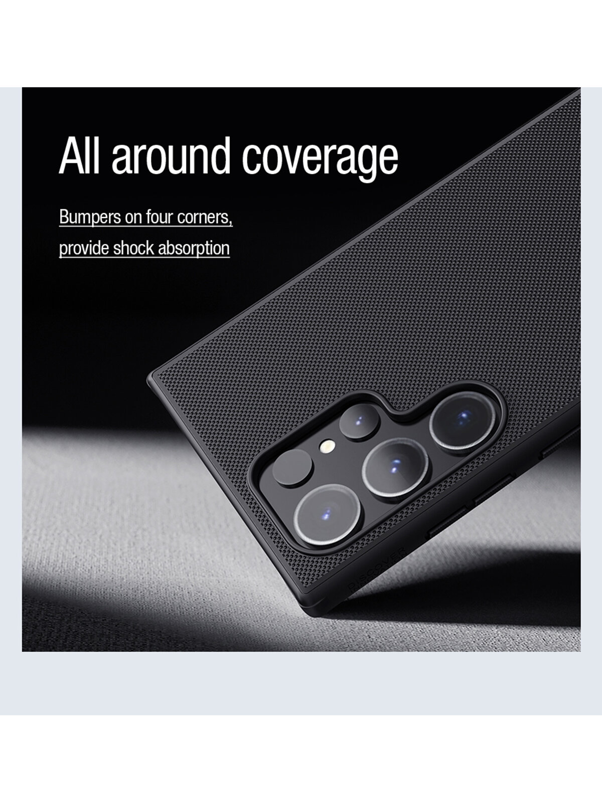 Выполнен в форме накладки из прочного пластика. Обрамлен бампером из пластичного термополиуретана. Аксессуар в точности повторяет контуры телефона, разъемы и кнопки остаются в свободном доступе. Рифленая задняя поверхность с покрытием soft-touch приятна на ощупь и не скользит в руке. Для защиты дисплея боковые грани аксессуара слегка приподняты над экраном смартфона. Во внутреннюю часть корпуса встроено магнитное кольцо для надежного сцепления с аксессуарами.