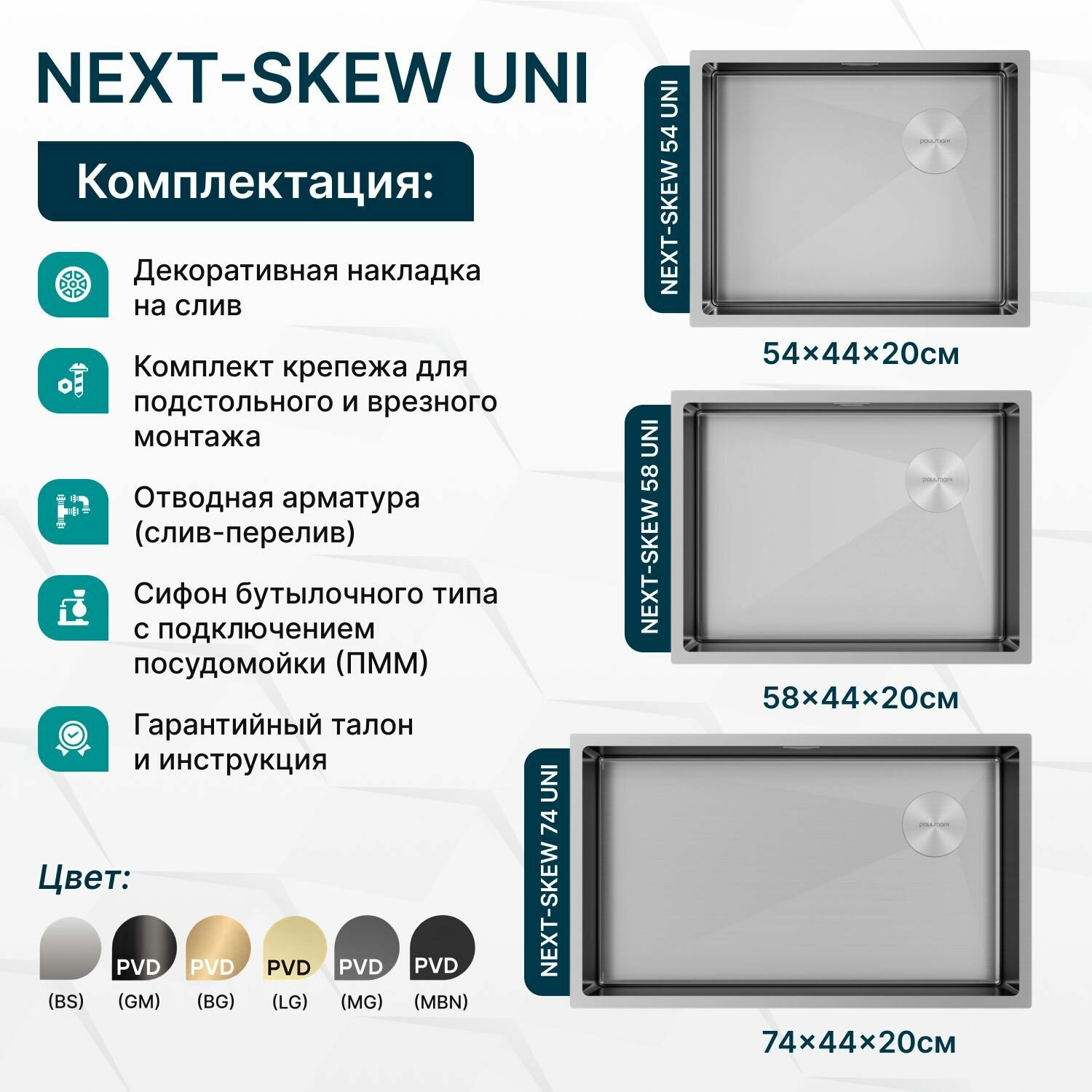 Кухонная мойка Paulmark Next-Skew 580 брашированное золото. Не подвержена деформации. Выдерживает большой вес посуды и продуктов. Имеет шумопоглощающее покрытие Stille на внешней стороне чаши. Устойчива к термическим воздействиям. Устойчива к образованию ржавчины. Не задерживает загрязнения на поверхности. Безопасна для здоровья. Легка в уходе и чистке. ШхДхГ: 580x440x200