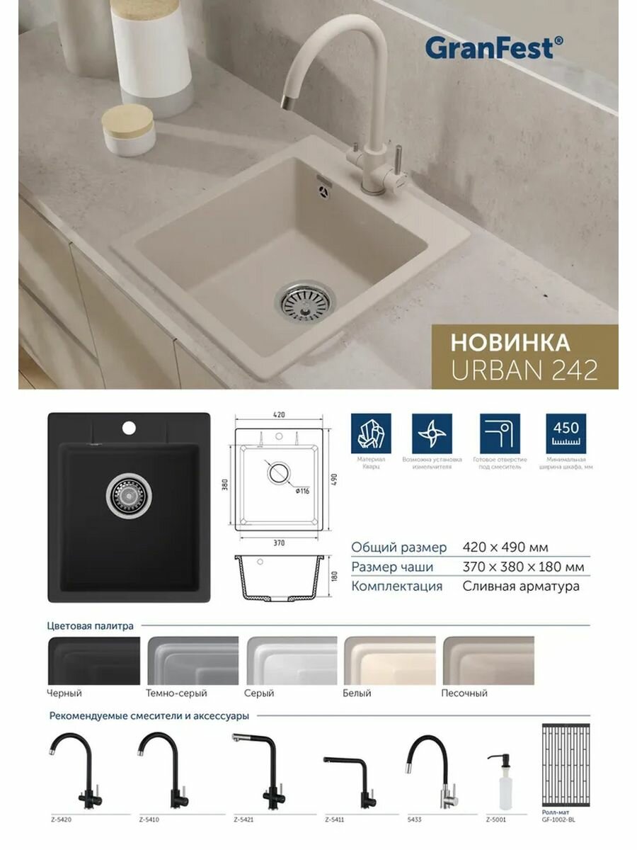 GRANFEST - настоящая находка для тех, кто занимается дизайном кухонных интерьеров.Эта модель была создана специально для столов шириной 450 мм.Глубина чаши составляет 180 мм, что считается оптимальным размером для кухонных моек.Простая форма этой модели создает сдержанно элегантный образ, отражающий безупречный вкус владельцев дома.Не менее важным фактором является возможность установки в кухонные мойки коллекции Urban незаменимого на кухне помощника любой хозяйки измельчителя бытовых отходов.Все кухонные мойки коллекции Urban комплектуются сливной арматурой с дополнительным выводом для посудомоечной машины или стиральной машины.