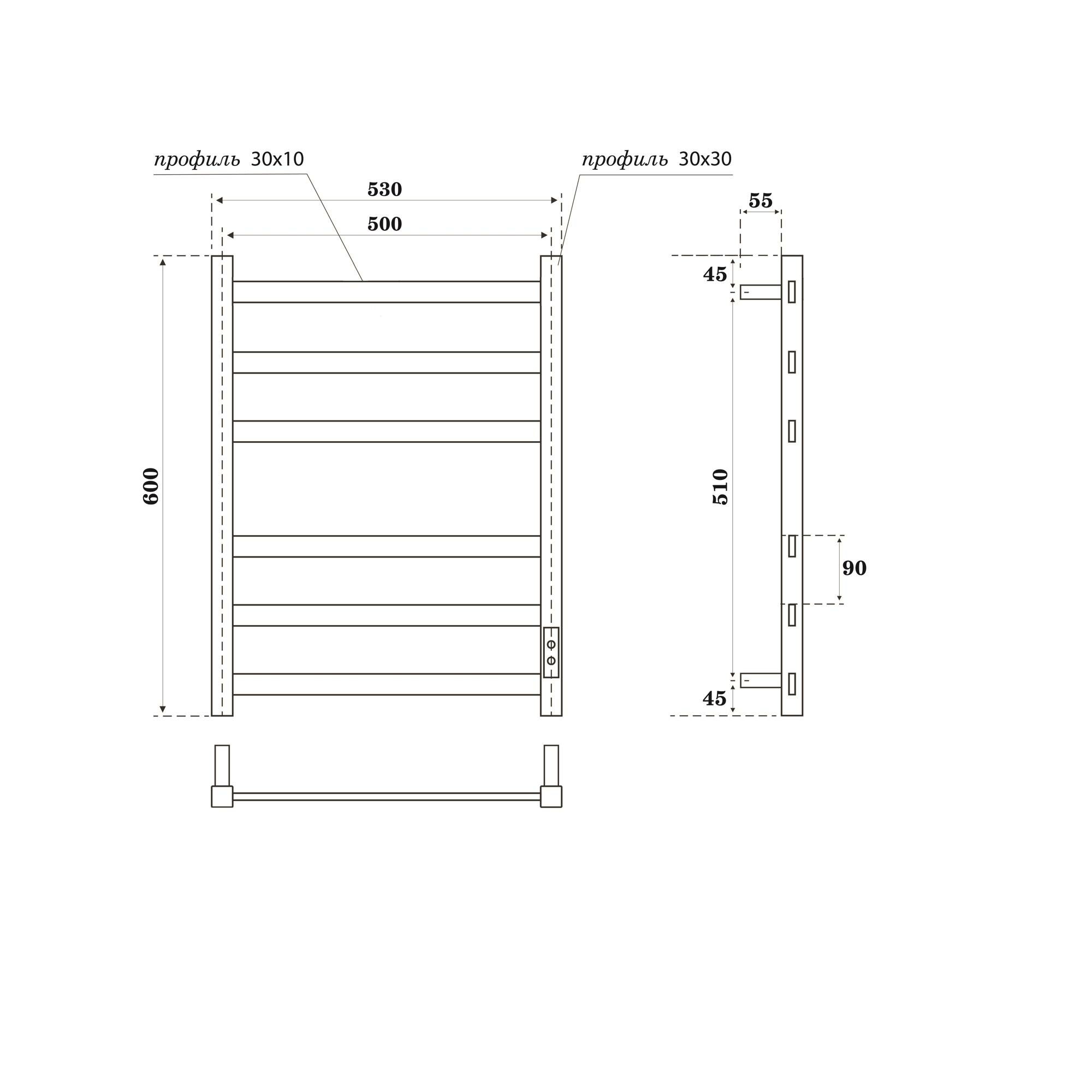 Электрический полотенцесушитель Point Меркурий 60x53 черный. Межосевое расстояние 500 мм. Диммер справа, таймер, площадь обогрева 1.4 м2. Комплектация:Полотенцесушитель - 1 шт, кронштейны для крепления к стене - 3 шт, сетевой кабель - 1 шт, комплект скрытого подключения - 1 шт, паспорт/гарантийный талон - 1 шт