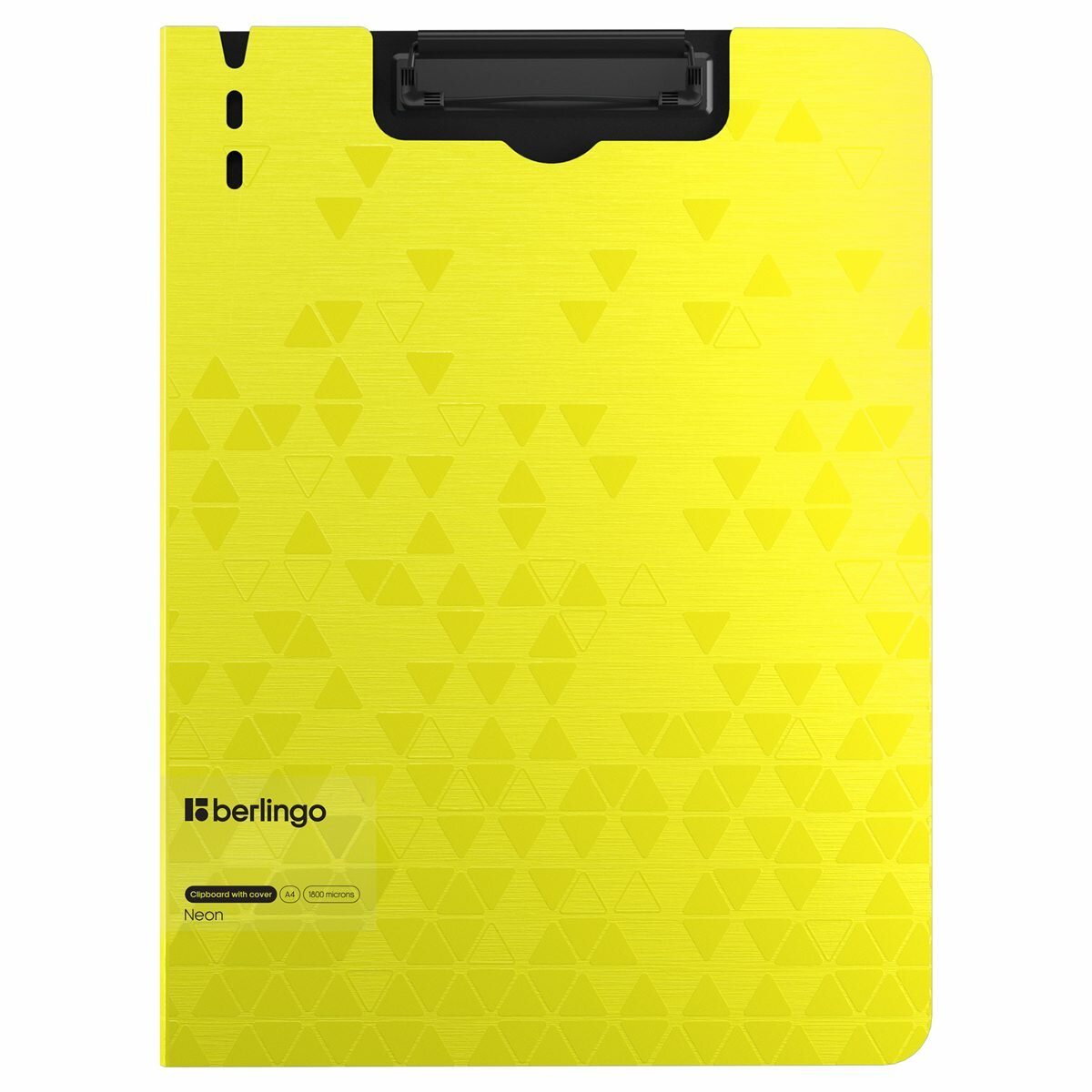 Папка–планшет с зажимом Berlingo серии Neon размером 320*225 мм изготовлена из плотного пластика (полифом) толщиной 1,8 мм. Вместимость папки – 100 листов, ширина корешка – 10 мм. Яркий неоновый цвет внешней стороны в сочетании с уникальной фактурой поверхности, чёрный цвет внутренней поверхности с прижимом. Чёрный металлический зажим для фиксации документов. Возможность раскрытия папки на 360 градусов. Вырубки на крышке позволяют легко закрепить ручку на папке. Позволяет делать записи на весу.