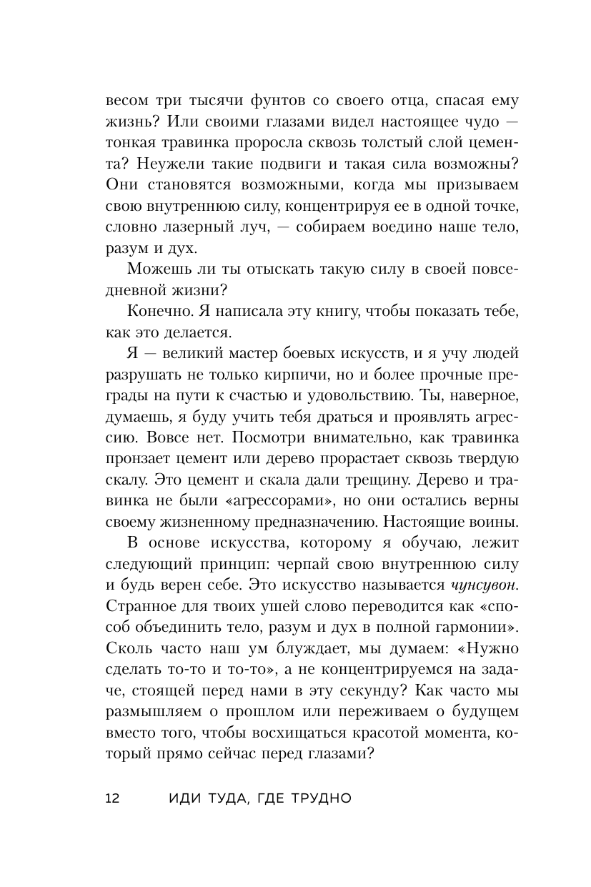 Узнайте тайны древнего искусства чунсувон. Только в России продано 100 000 экземпляров. Вкус флэт-уайта яркий, как и книга "Иди туда, где трудно", которая рассказывает про борьбу с собой и преодоление преград. С ее помощью вы разовьете внутреннюю силу, научитесь идти до конца и никогда не сдаваться. Ким Таэ Юн, мотивационный спикер, прошла тяжелый путь самосовершенствования, чтобы основать школу единоборств и возглавить ведущую технологическую компанию в Кремниевой долине. Узнайте, как: - Проложить путь к своей мечте. - Превратить недостатки в преимущества. - Поддерживать баланс во всех сферах жизни. - Победить страхи и перестать зависеть от чужого мнения.