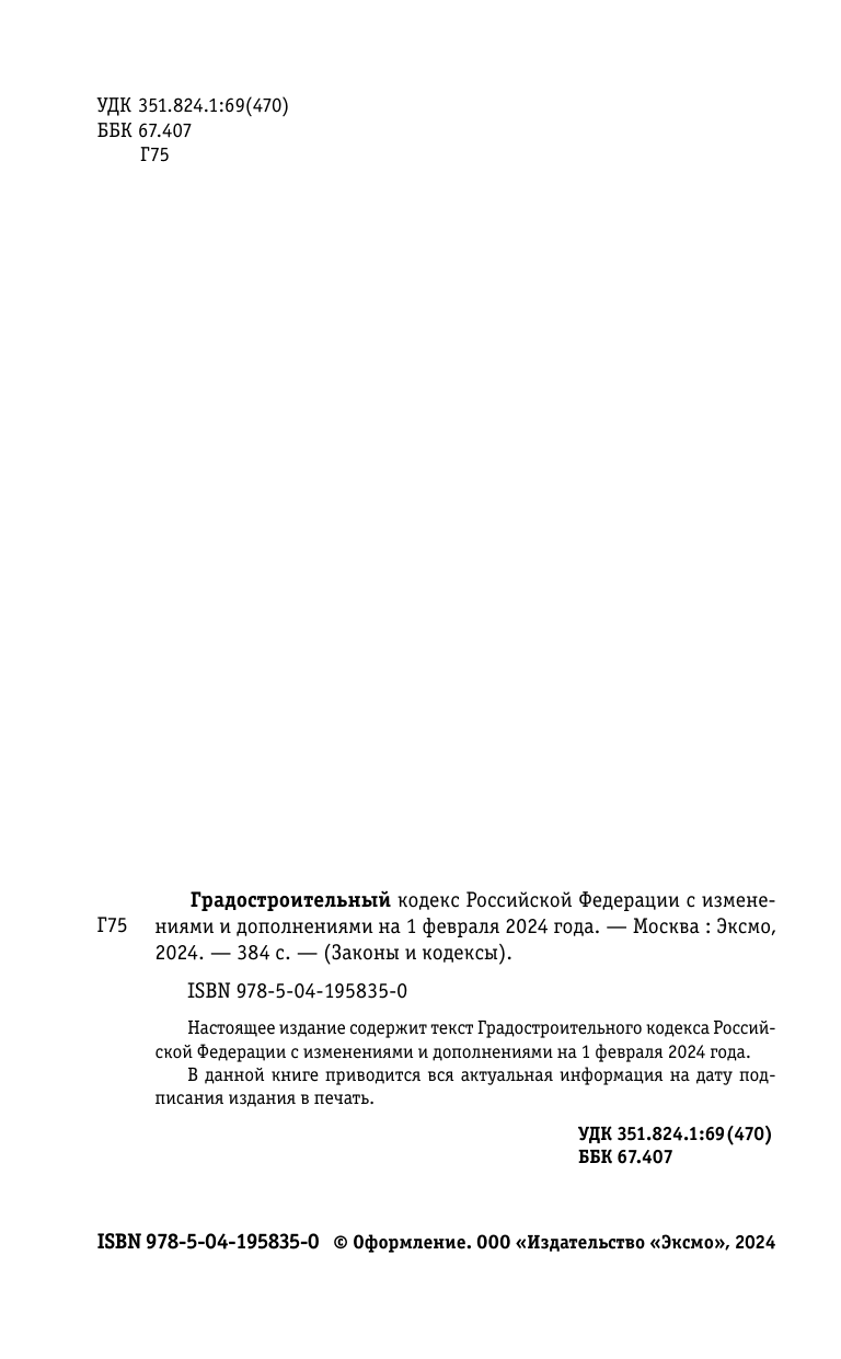 Градостроительный кодекс РФ по сост. на 01.02.24 / ГРК РФ (Верещагин В.В.); ООО "Издательство "Эксмо", 2024