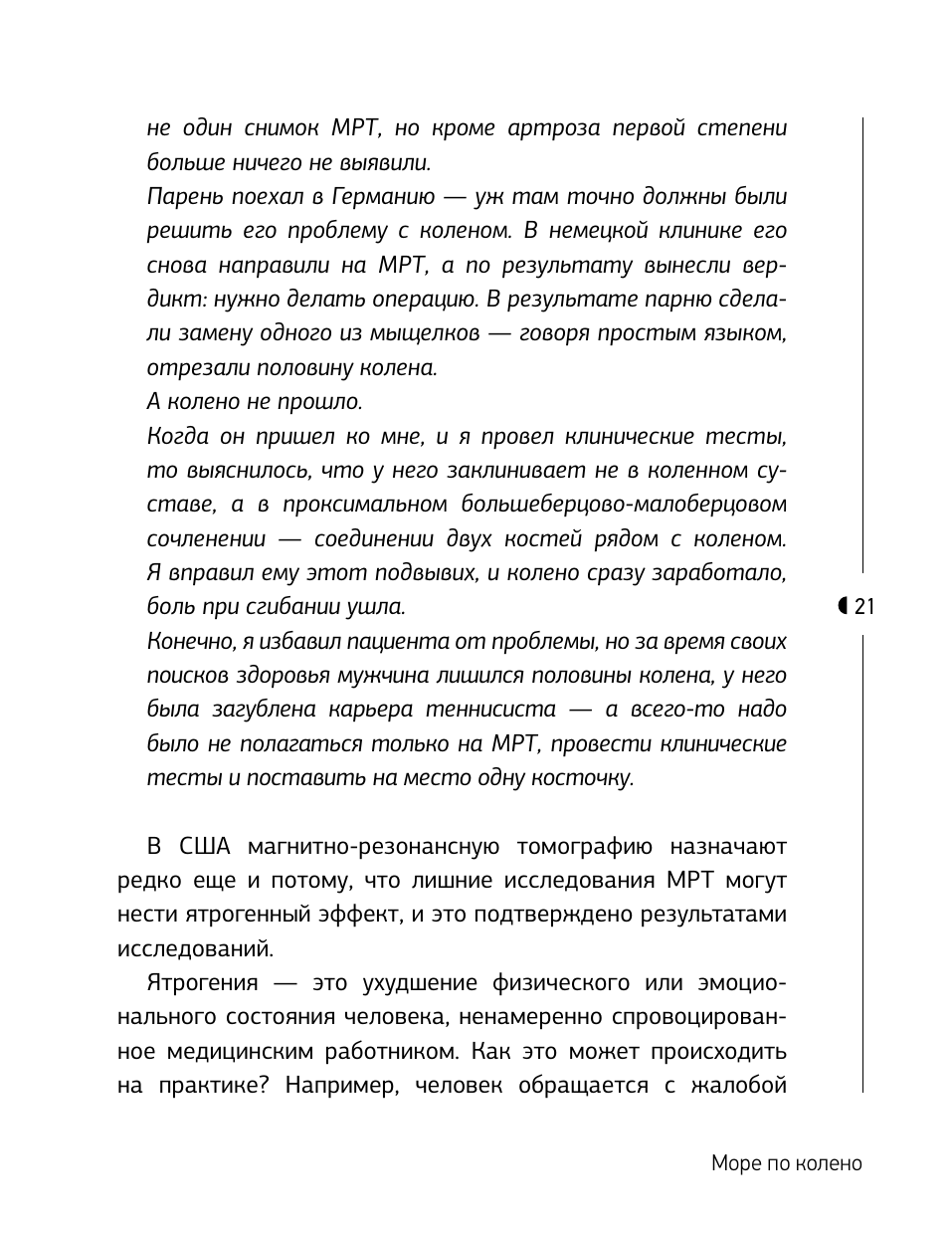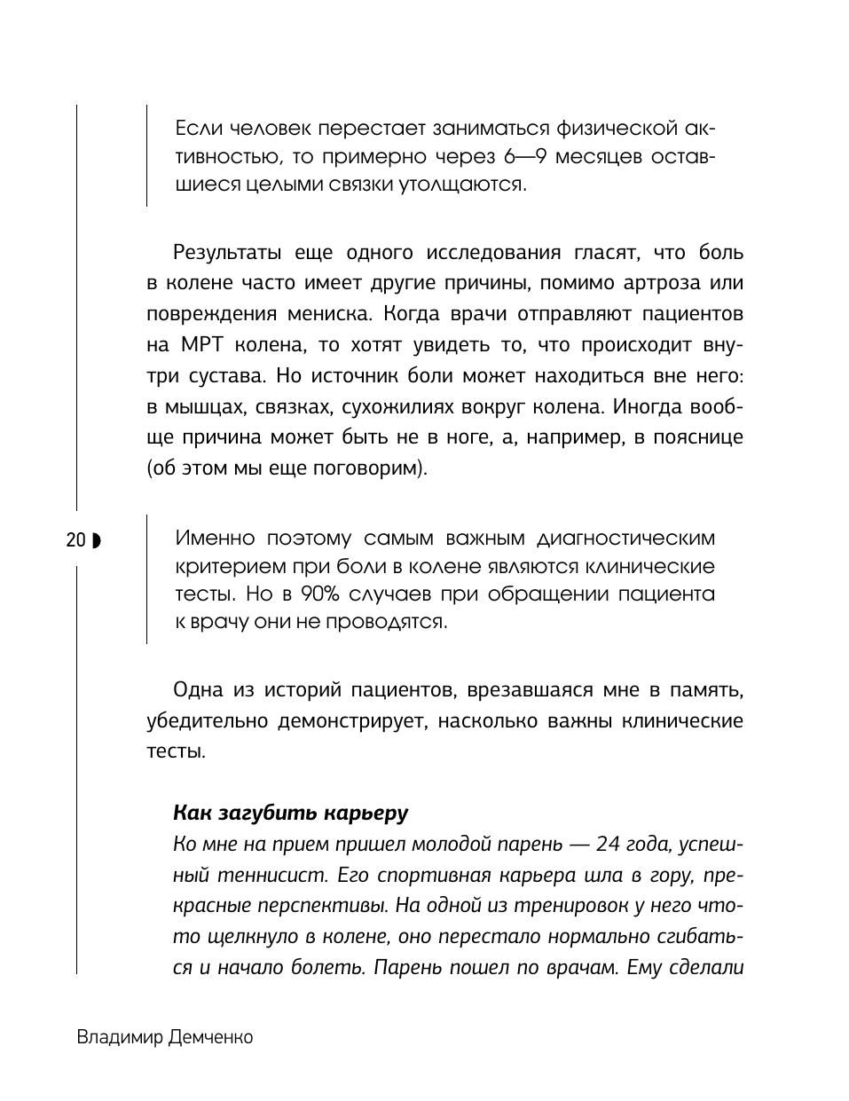 Если вы хоть раз страдали от боли в колене – эта книга для вас. Последствия травмы, хруст, скованность, атравматические боли и другие проблемы с коленным суставом – все это можно вылечить и вернуться к активному образу жизни. И первый шаг к успешному лечению – верная диагностика. С помощью этой книги вы сможете лучше понять, что на самом деле происходит с вашим коленом, а также узнаете: