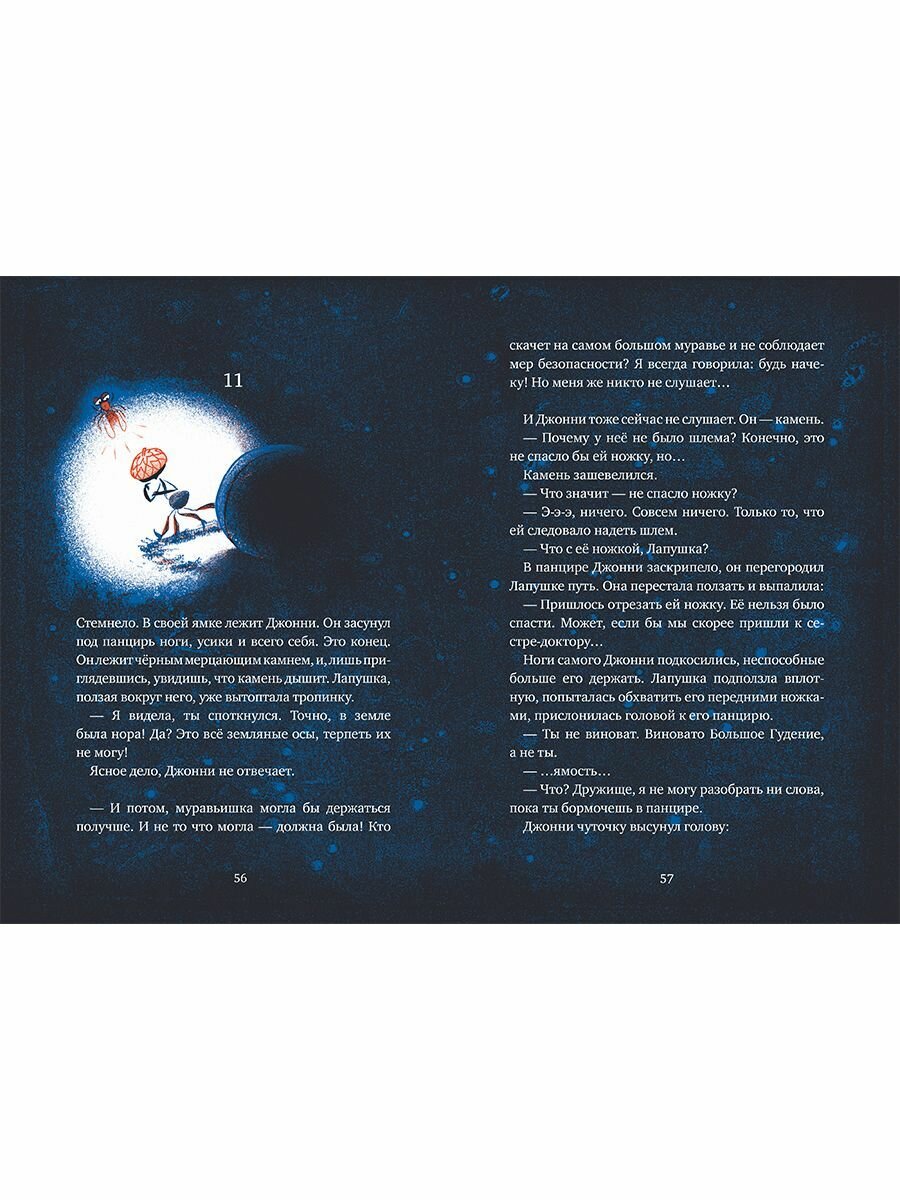 Но однажды весной с неправильным муравьем Джонни произошло что-то совсем странное: он почувствовал резкие вибрации в своем толстеньком теле. Что же это? Должно быть, он болен! Муравьиха-фельдшер (а это точно была она, а не какая-нибудь вредная сестра? Ведь Джонни так плохо видит) подтвердила его опасения: он должен срочно покинуть муравейник, иначе им всем конец!