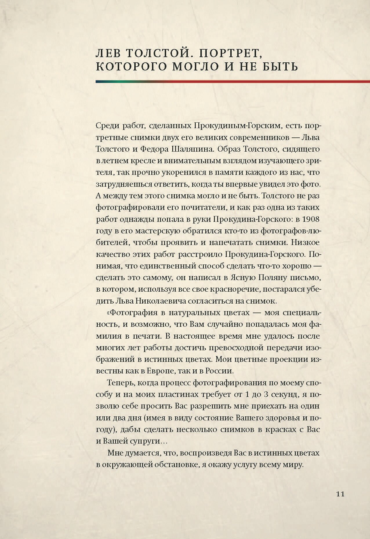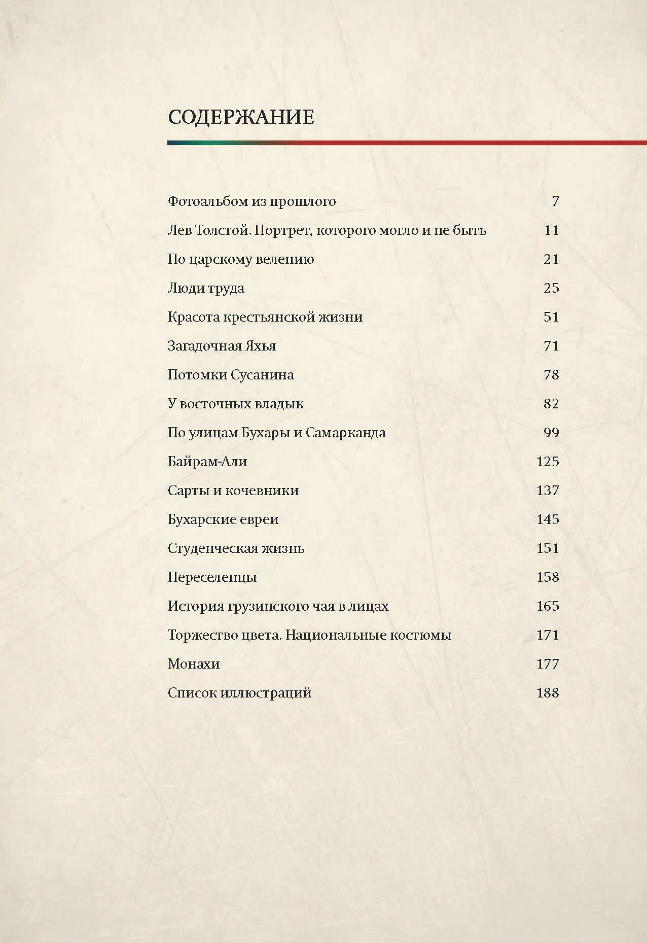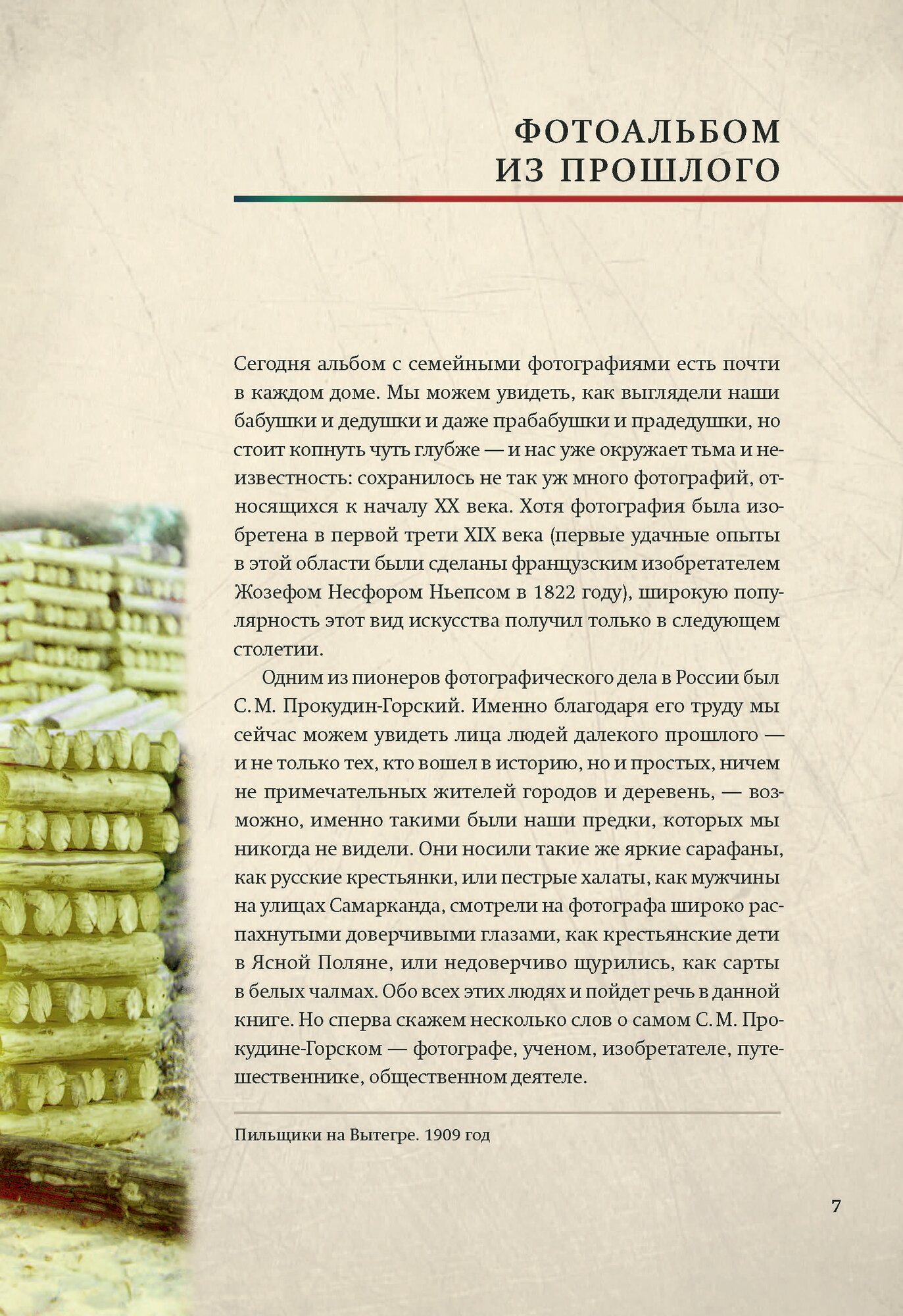 В альбоме мы можем увидеть лица этих людей — и не только тех, кто вошел в историю, но и простых, ничем не примечательных жителей городов и деревень. Возможно, именно такими были наши предки: носили яркие сарафаны, как русские крестьянки, или пестрые халаты, как мужчины на улицах Самарканда, смотрели на фотографа широко распахнутыми глазами, как крестьянские дети в Ясной Поляне, или недоверчиво щурились, как сарты в белых чалмах. Обо всех этих людях и пойдет речь в данной книге. Судьбы неудачливого бухарского эмира, великого русского писателя, монаха из отдаленного скита и рабочих с оружейного завода невидимой нитью связал один-единственный человек с фотоаппаратом — С. М. Прокудин-Горский.