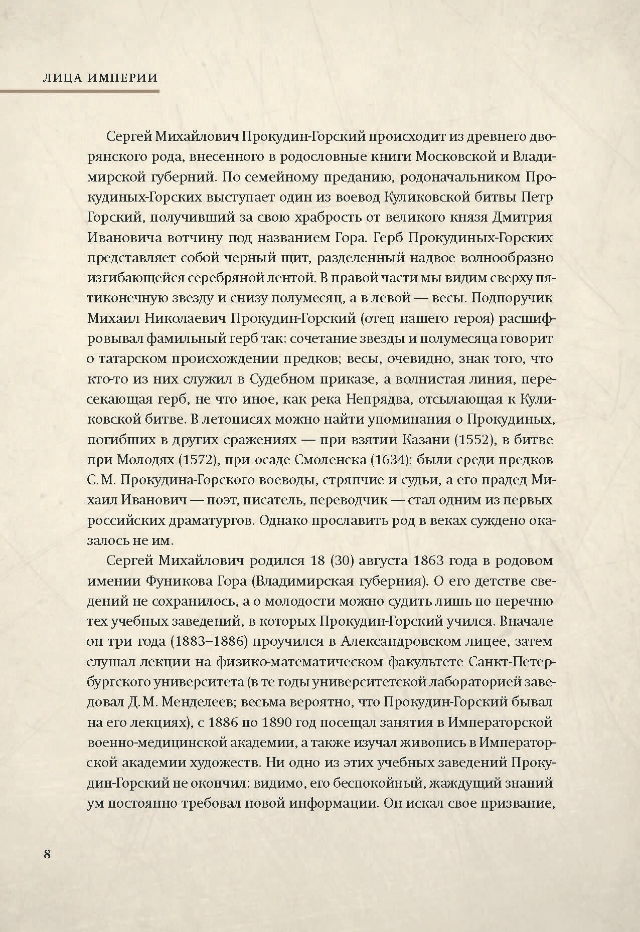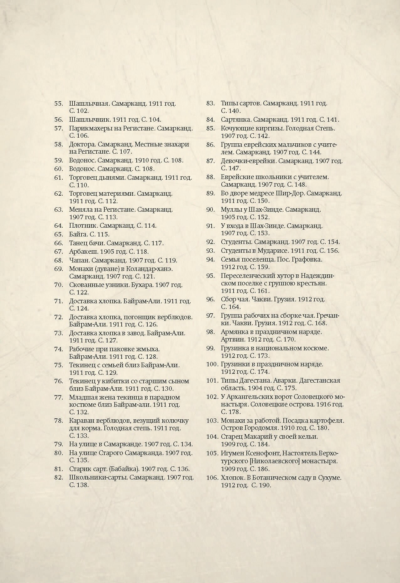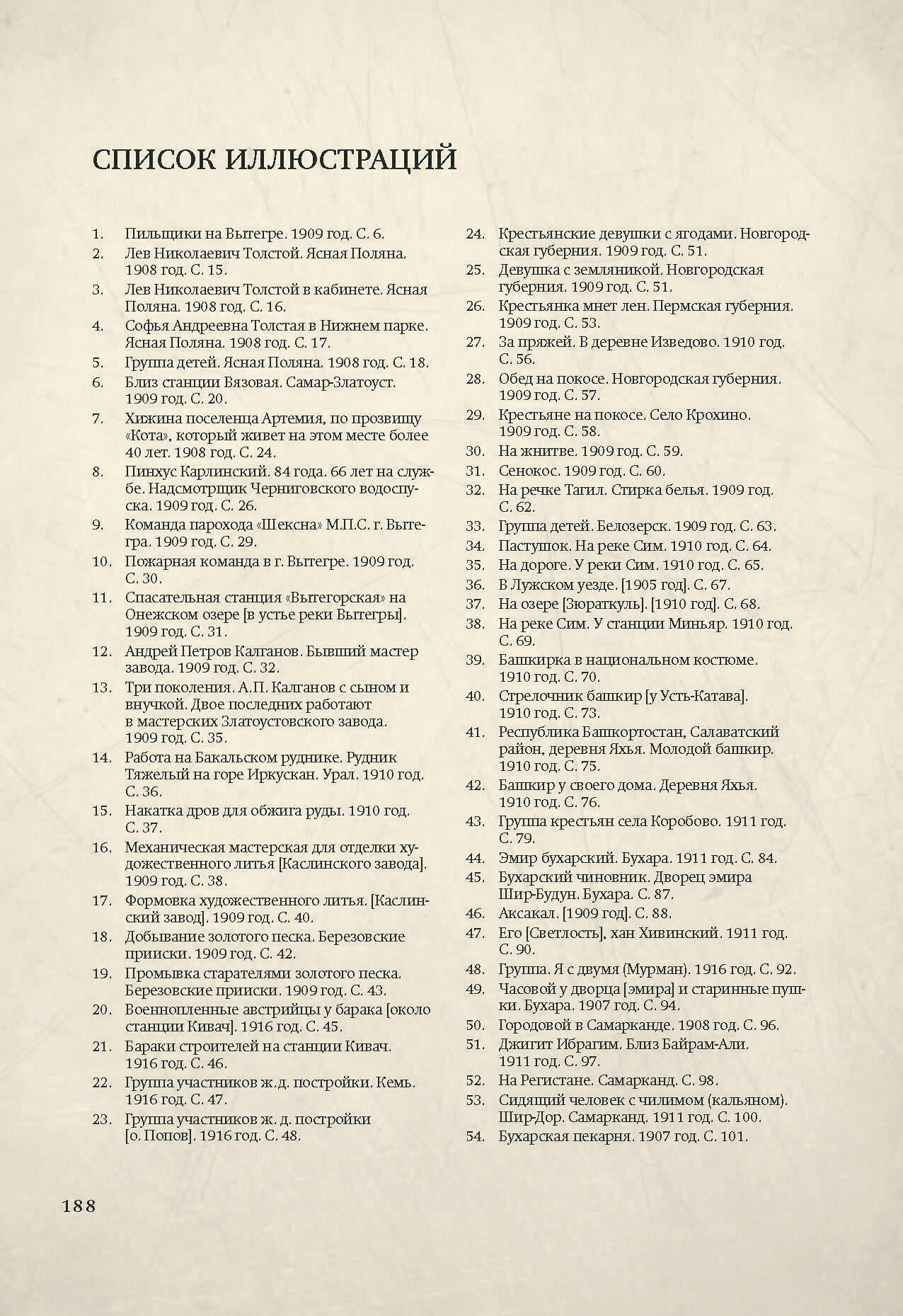В альбоме мы можем увидеть лица этих людей — и не только тех, кто вошел в историю, но и простых, ничем не примечательных жителей городов и деревень. Возможно, именно такими были наши предки: носили яркие сарафаны, как русские крестьянки, или пестрые халаты, как мужчины на улицах Самарканда, смотрели на фотографа широко распахнутыми глазами, как крестьянские дети в Ясной Поляне, или недоверчиво щурились, как сарты в белых чалмах. Обо всех этих людях и пойдет речь в данной книге. Судьбы неудачливого бухарского эмира, великого русского писателя, монаха из отдаленного скита и рабочих с оружейного завода невидимой нитью связал один-единственный человек с фотоаппаратом — С. М. Прокудин-Горский.