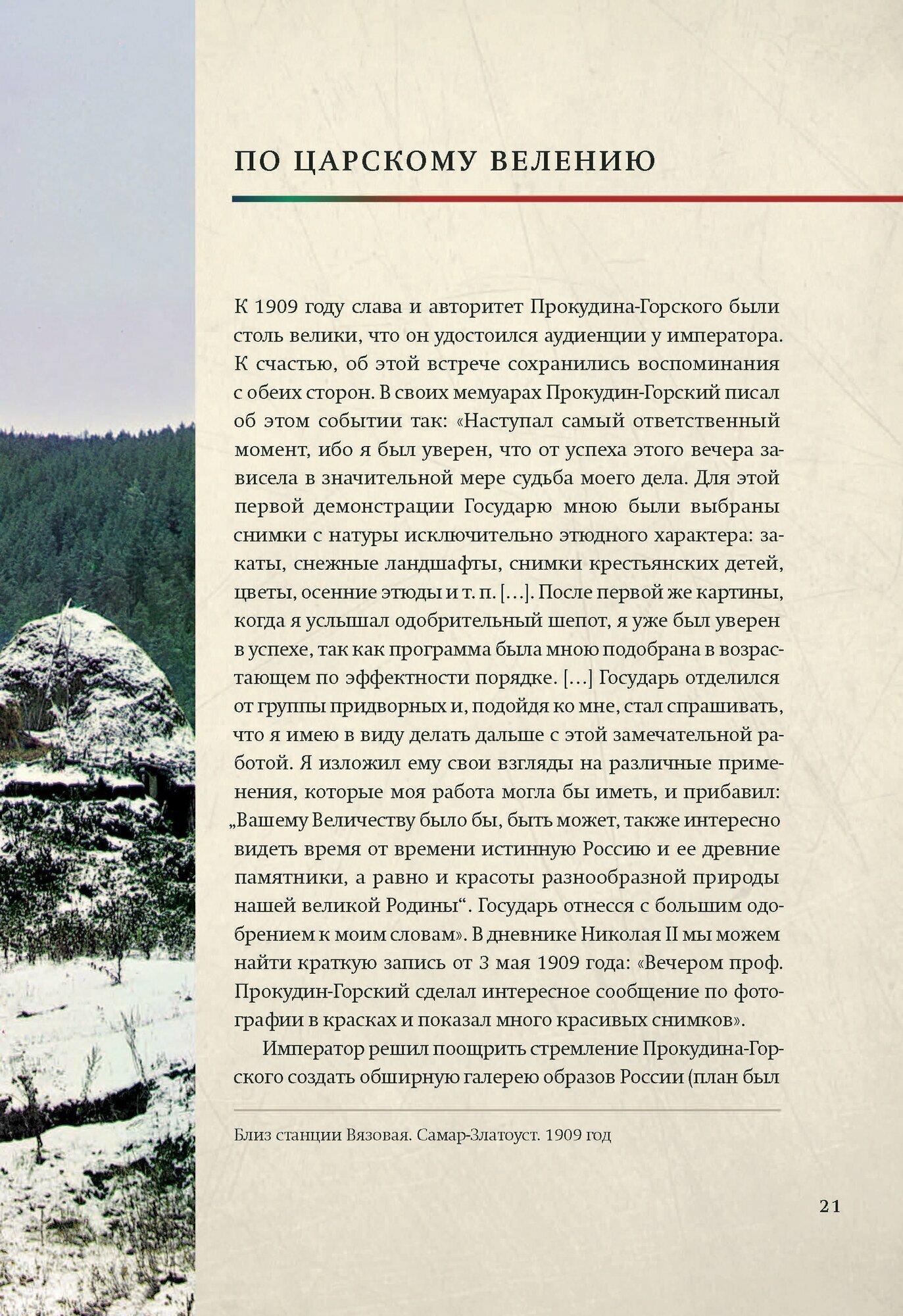 С. М. Прокудин-Горский — один из пионеров цветной фотографии, создавший в 1909–1916 годах по заказу Николая II уникальную коллекцию снимков, которую можно назвать визуальной энциклопедией Российской империи. Фотографу удалось запечатлеть мир накануне его крушения; в объектив фотокамеры смотрели люди, не знавшие, что скоро их жизнь изменится — навеки и непоправимо.