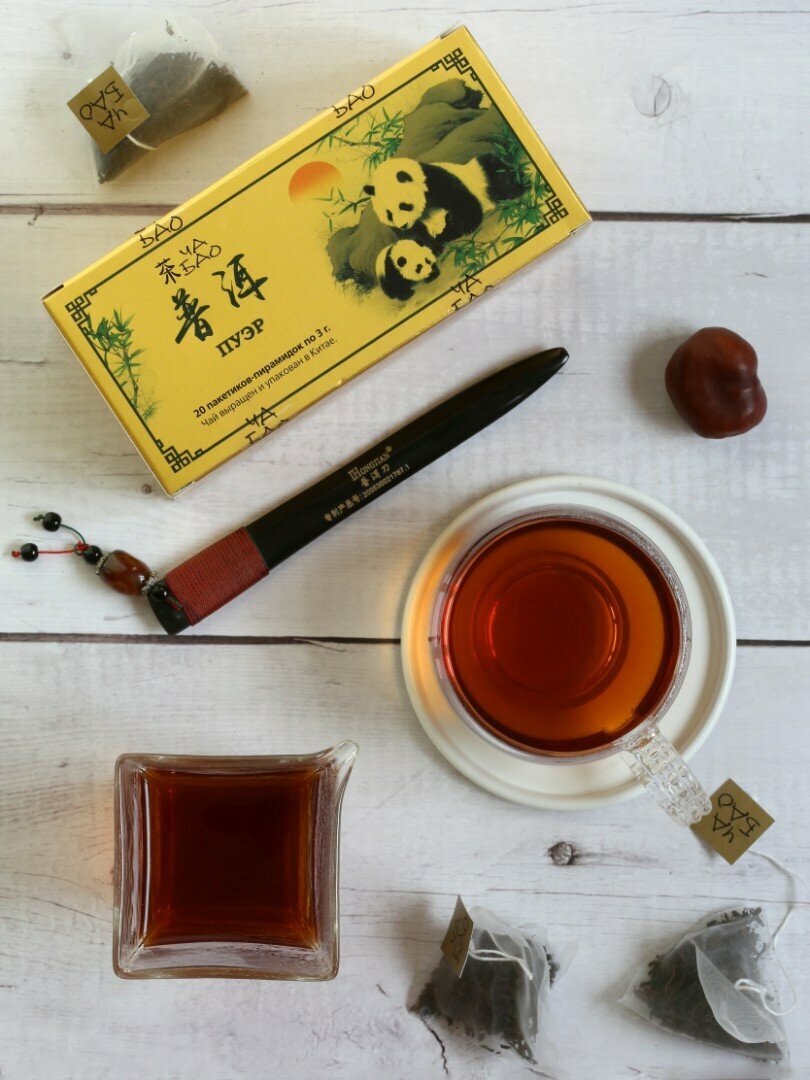 Новинка! Качественный листовой китайский чай пуэр от компании «Ча Бао» теперь и в пакетиках-пирамидках!Пуэр — черный постферментированный чай.Это один из немногих чаев, ценность которого с возрастом увеличивается, а вкус — улучшается. Пуэр идеально подходит людям, ведущий активный образ жизни: он превосходно тонизирует и помогает легче справиться с нагрузками и стрессом. Имеет специфический аромат и благородный, выдержанный вкус. Панда — особо любимое и почитаемое животное в Китае. Панду считают символом дружелюбия, взаимопонимания, добрососедства и мира. Китайцы верят, что талисман в виде «китайского медведя» приносит человеку крепкое здоровье и долголетие. Бамбук символизирует счастье и удачу. Имея крепкий, но гибкий стебель, бамбук стал для китайцев также символом выносливости и духовной силы. Чай «Ча Бао» Пуэр бодрит, улучшает настроение и дарит человеку стойкость.