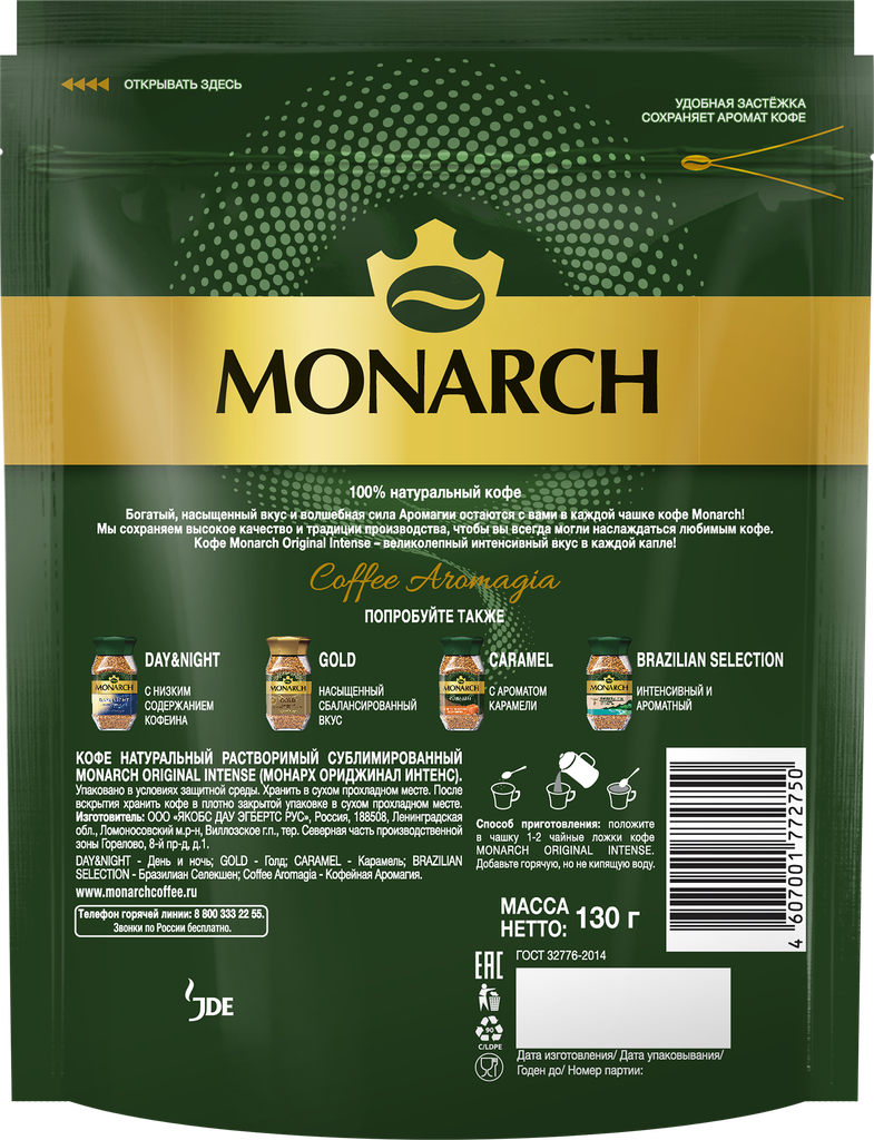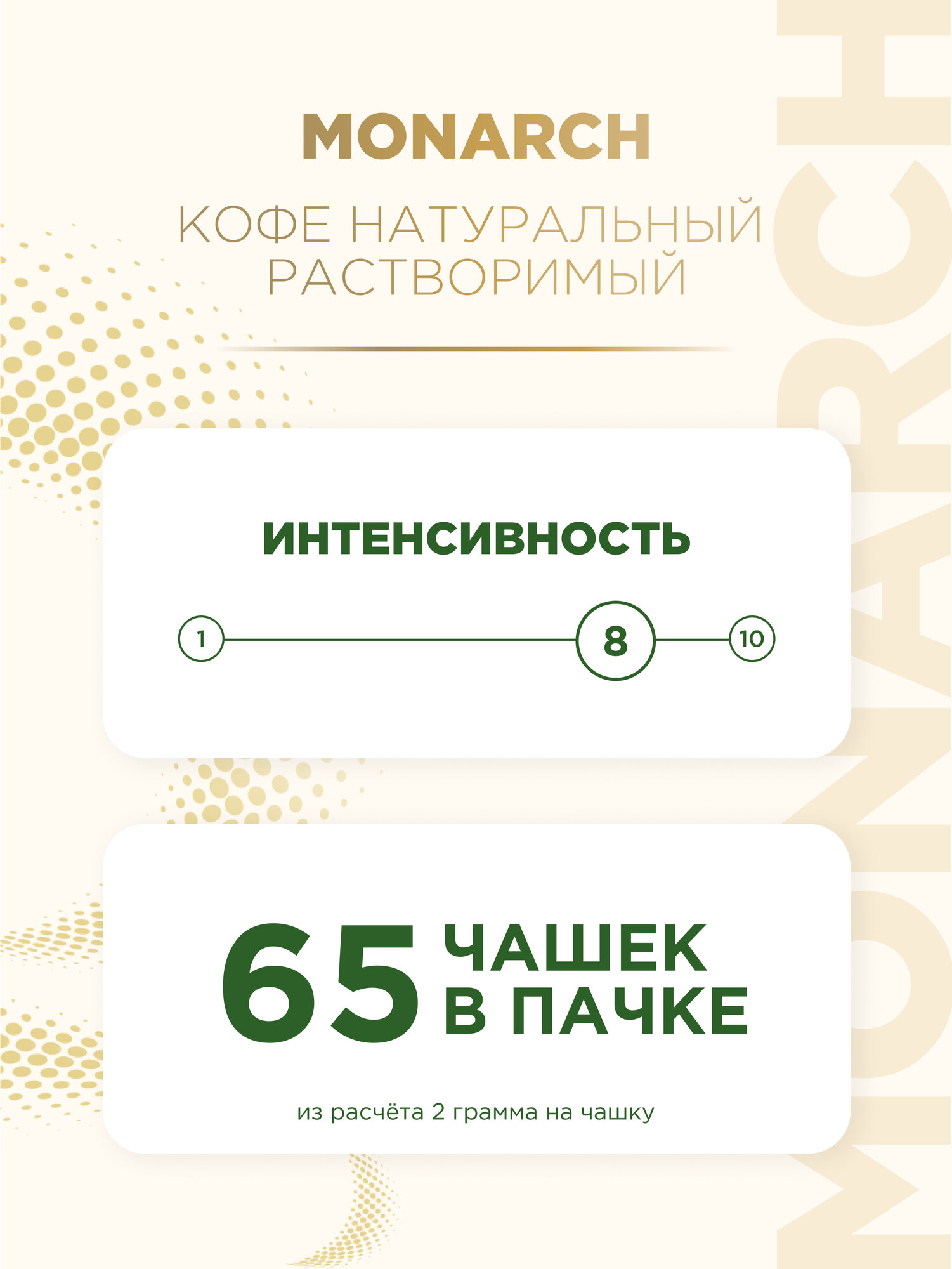 Богатый, насыщенный вкус и волшебная сила Аромагии остаются с вами в каждой чашке кофе Monarch! Мы сохраняем высокое качество и традиции производства, чтобы вы всегда могли наслаждаться любимым кофе. Кофе Monarch Original Intense – великолепный интенсивный вкус в каждой капле!