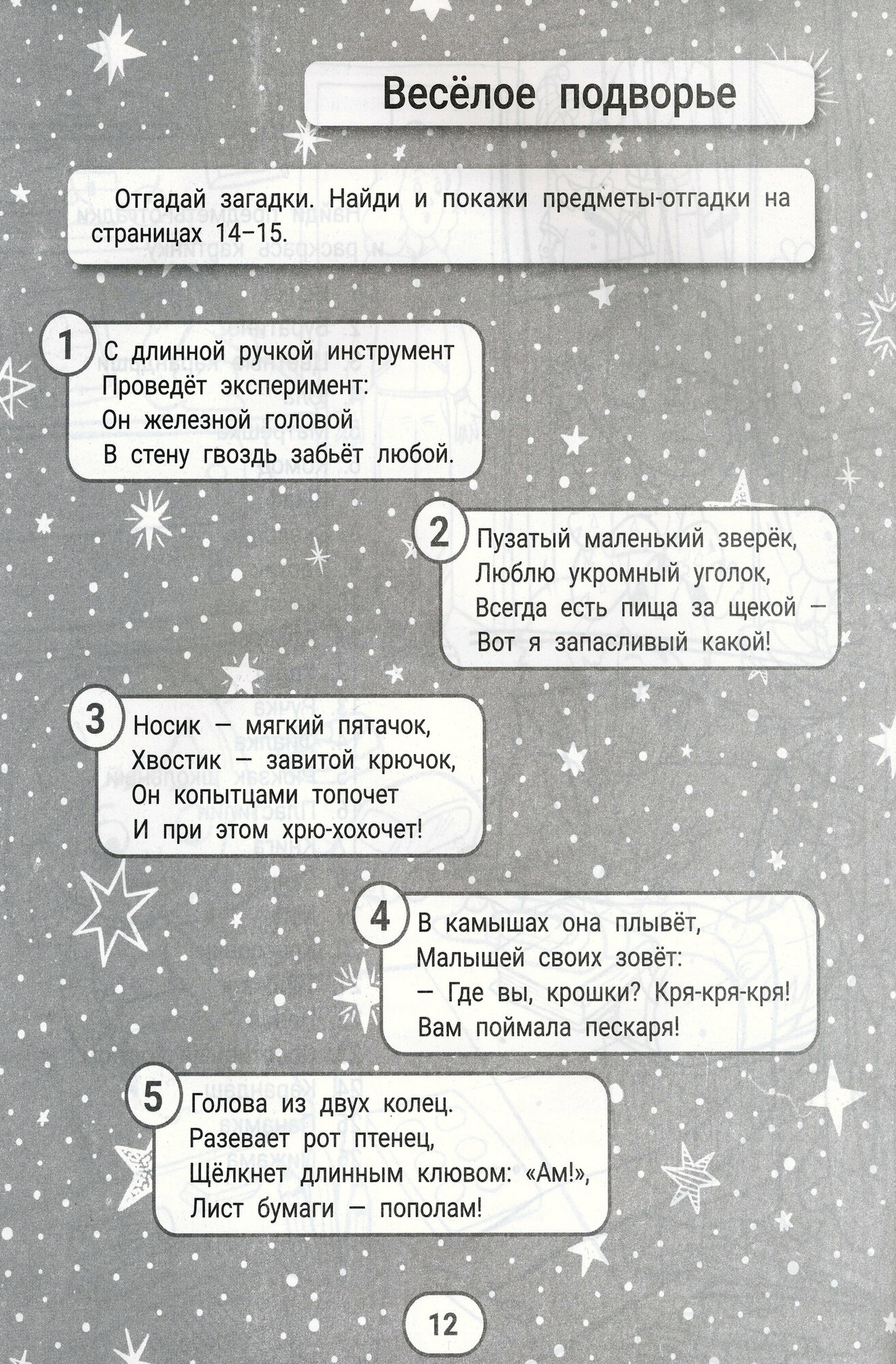Более 60 загадок и виммельбух-отгадок ждут самых сообразительных и внимательных ребят. Они будут с огромным интересом рассматривать иллюстрации с множеством деталей, искать и находить отгадки, раскрашивать. Загадки в увлекательной форме обогатят словарный запас и кругозор ребёнка. Данное пособие направлено на развитие навыков речи, способности к анализу и обобщению, умение самостоятельно делать умозаключения, развитие зрительного восприятия и мелкой моторики.