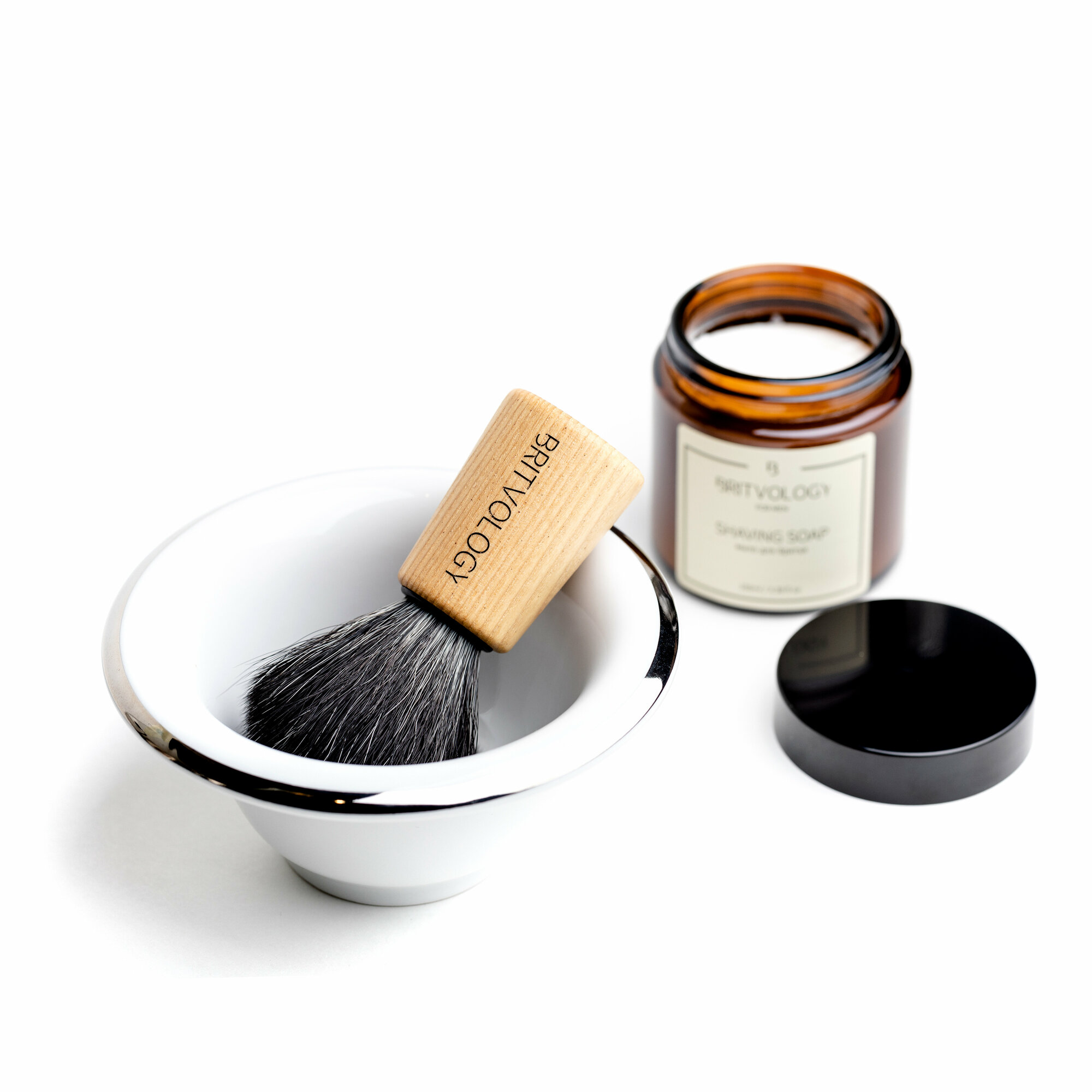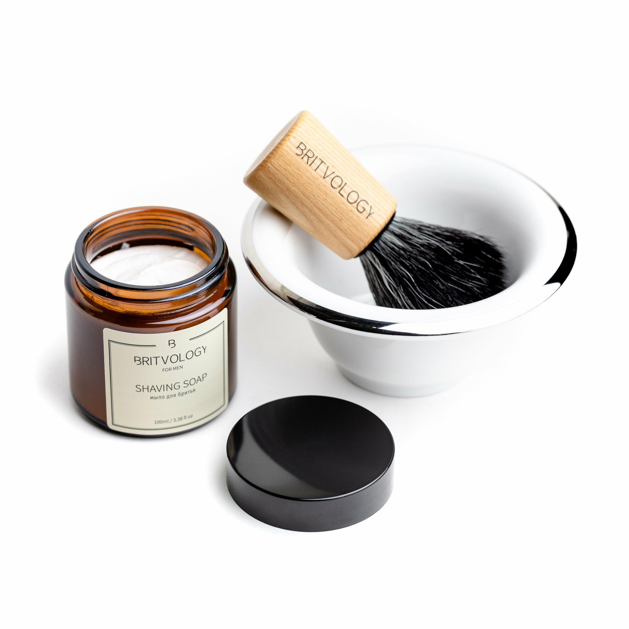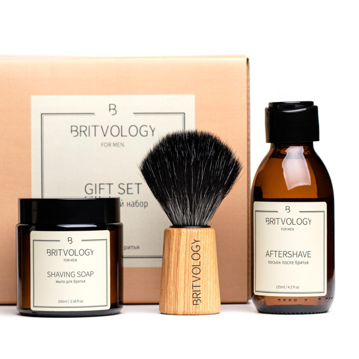 Подарочный набор из помазка BRITVOLOGY, крем-мыла для бритья и лосьона после бритья.