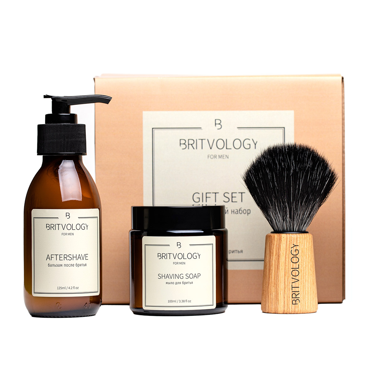 Подарочный набор из помазка BRITVOLOGY, крем-мыла для бритья и бальзама после бритья.